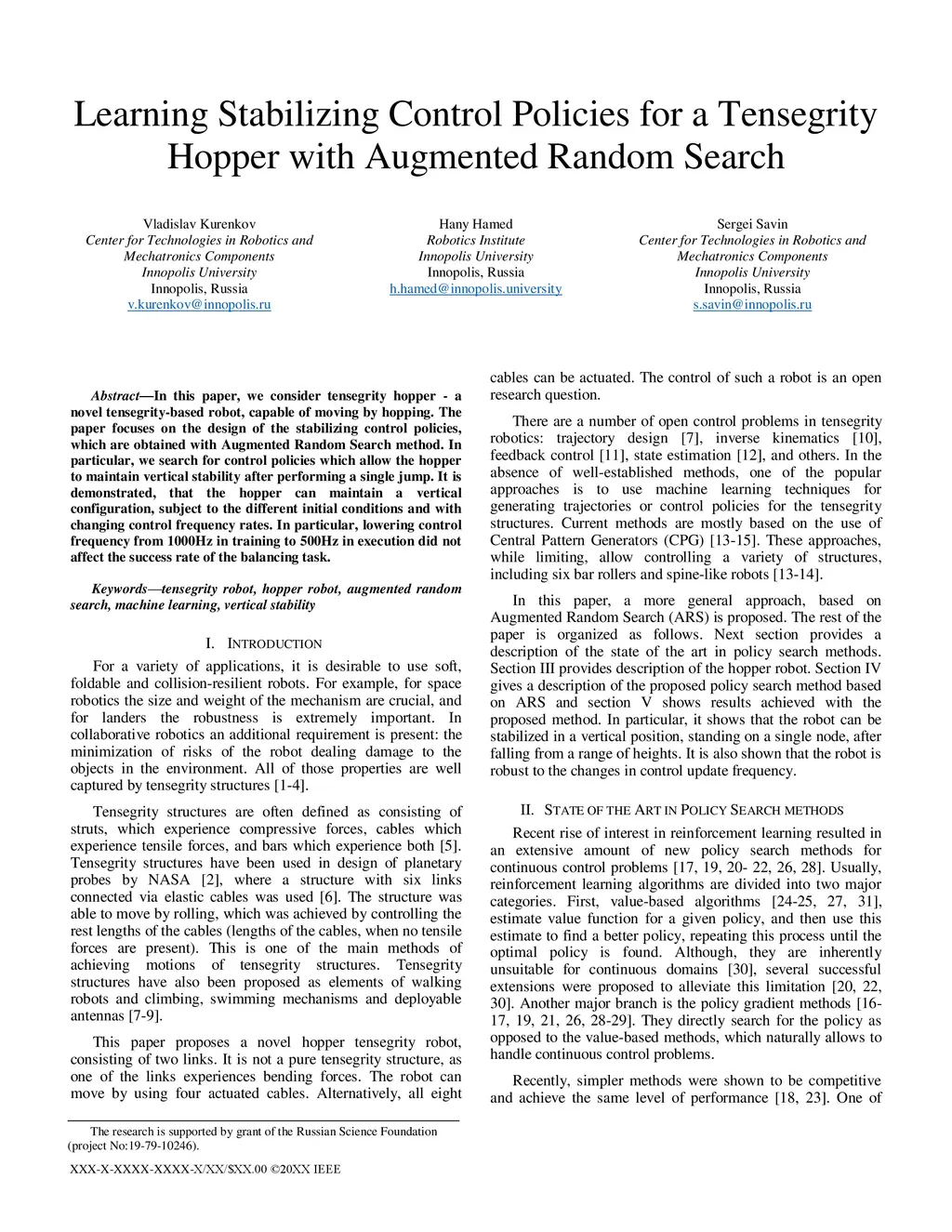 In this paper, we consider tensegrity hopper - a novel tensegrity-based robot, capable of moving by hopping. The paper focuses on the design of the stabilizing control policies, which are obtained with Augmented Random Search method. In particular, we search for control policies which allow the hopper to maintain vertical stability after performing a single jump. It is demonstrated, that the hopper can maintain a vertical configuration, subject to the different initial conditions and with changing control frequency rates. In particular, lowering control frequency from 1000Hz in training to 500Hz in execution did not affect the success rate of the balancing task.