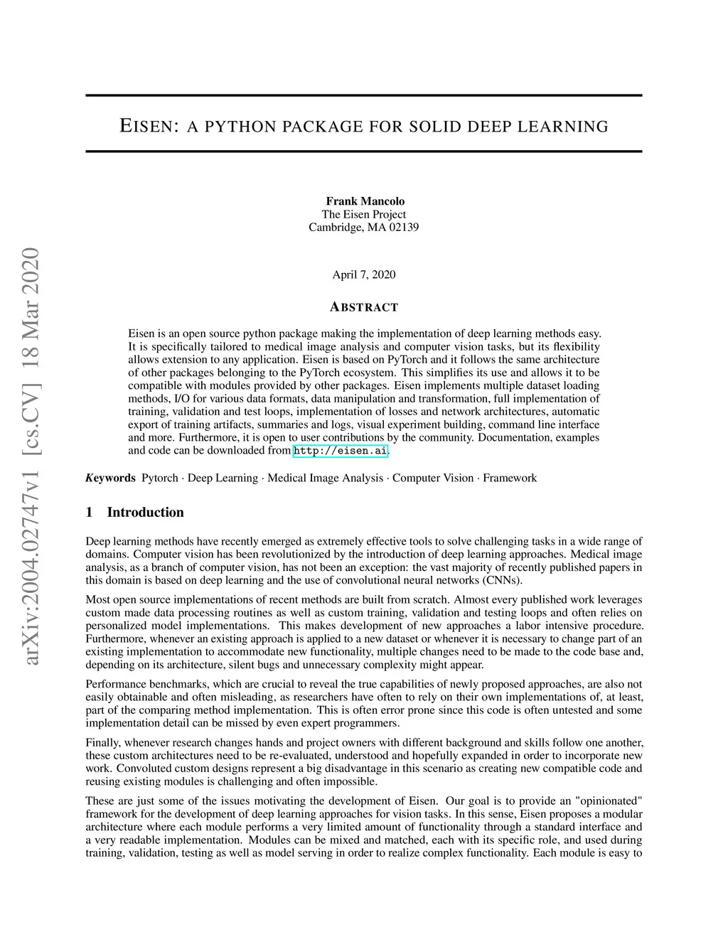 Eisen is an open source python package making the implementation of deep learning methods easy. It is specifically tailored to medical image analysis and computer vision tasks, but its flexibility allows extension to any application. Eisen is based on PyTorch and it follows the same architecture of other packages belonging to the PyTorch ecosystem. This simplifies its use and allows it to be compatible with modules provided by other packages. Eisen implements multiple dataset loading methods, I/O for various data formats, data manipulation and transformation, full implementation of training, validation and test loops, implementation of losses and network architectures, automatic export of training artifacts, summaries and logs, visual experiment building, command line interface and more. Furthermore, it is open to user contributions by the community. Documentation, examples and code can be downloaded from http://eisen.ai.