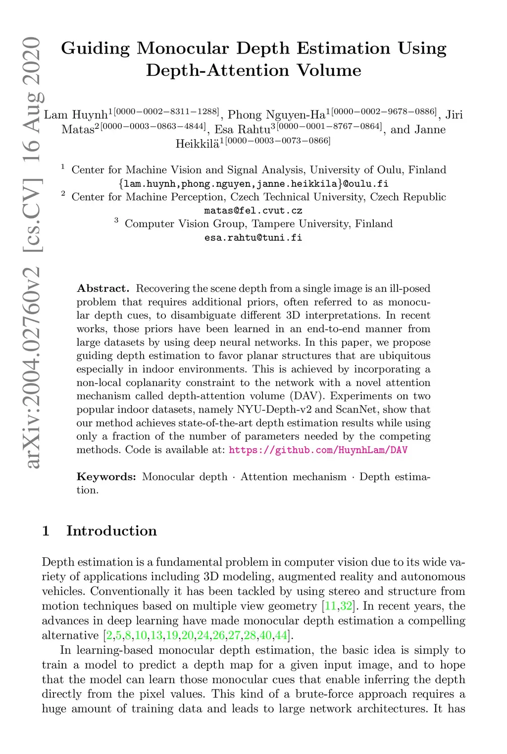 Recovering the scene depth from a single image is an ill-posed problem that requires additional priors, often referred to as monocular depth cues, to disambiguate different 3D interpretations. In recent works, those priors have been learned in an end-to-end manner from large datasets by using deep neural networks. In this paper, we propose guiding depth estimation to favor planar structures that are ubiquitous especially in indoor environments. This is achieved by incorporating a non-local coplanarity constraint to the network with a novel attention mechanism called depth-attention volume (DAV). Experiments on two popular indoor datasets, namely NYU-Depth-v2 and ScanNet, show that our method achieves state-of-the-art depth estimation results while using only a fraction of the number of parameters needed by the competing methods.