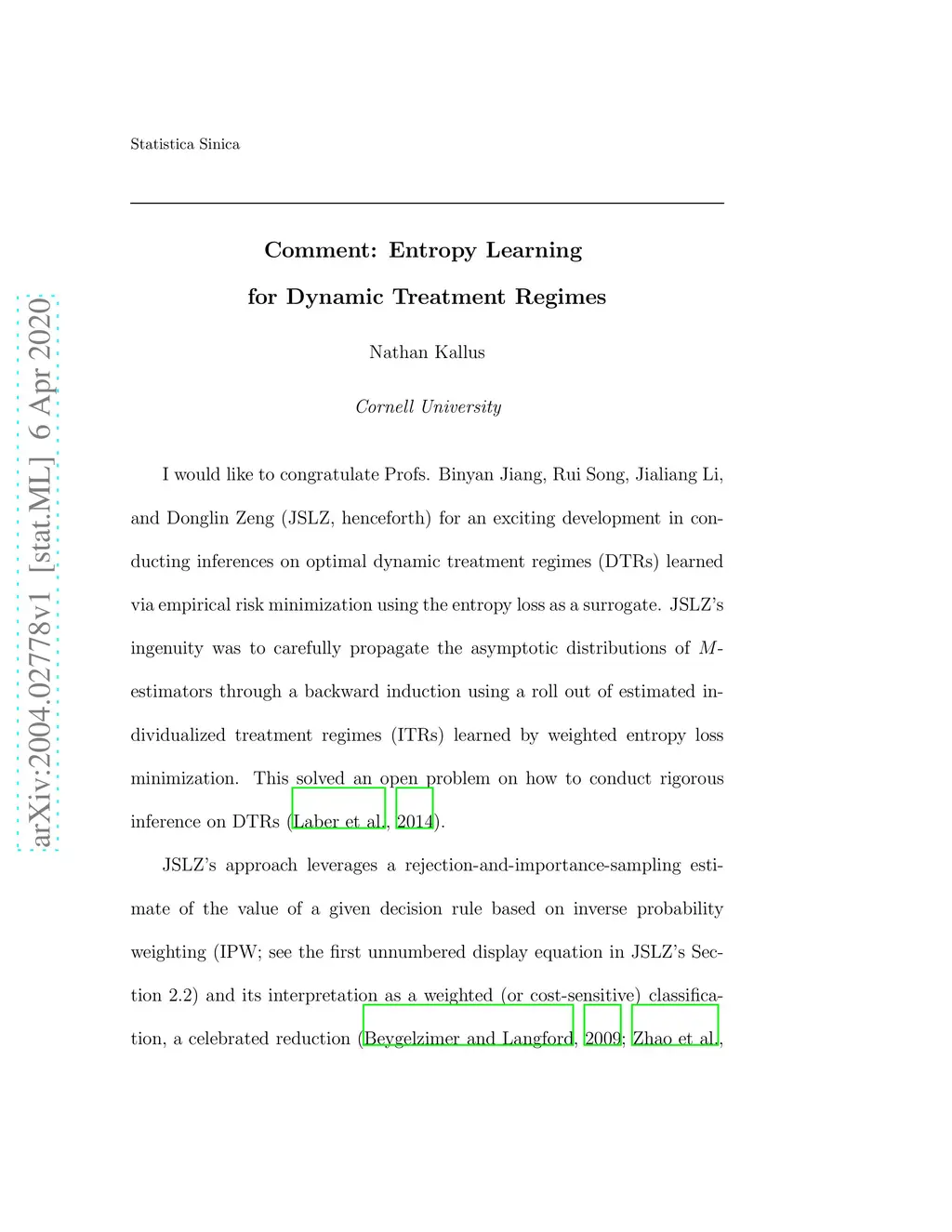 Comment: Entropy Learning for Dynamic Treatment Regimes