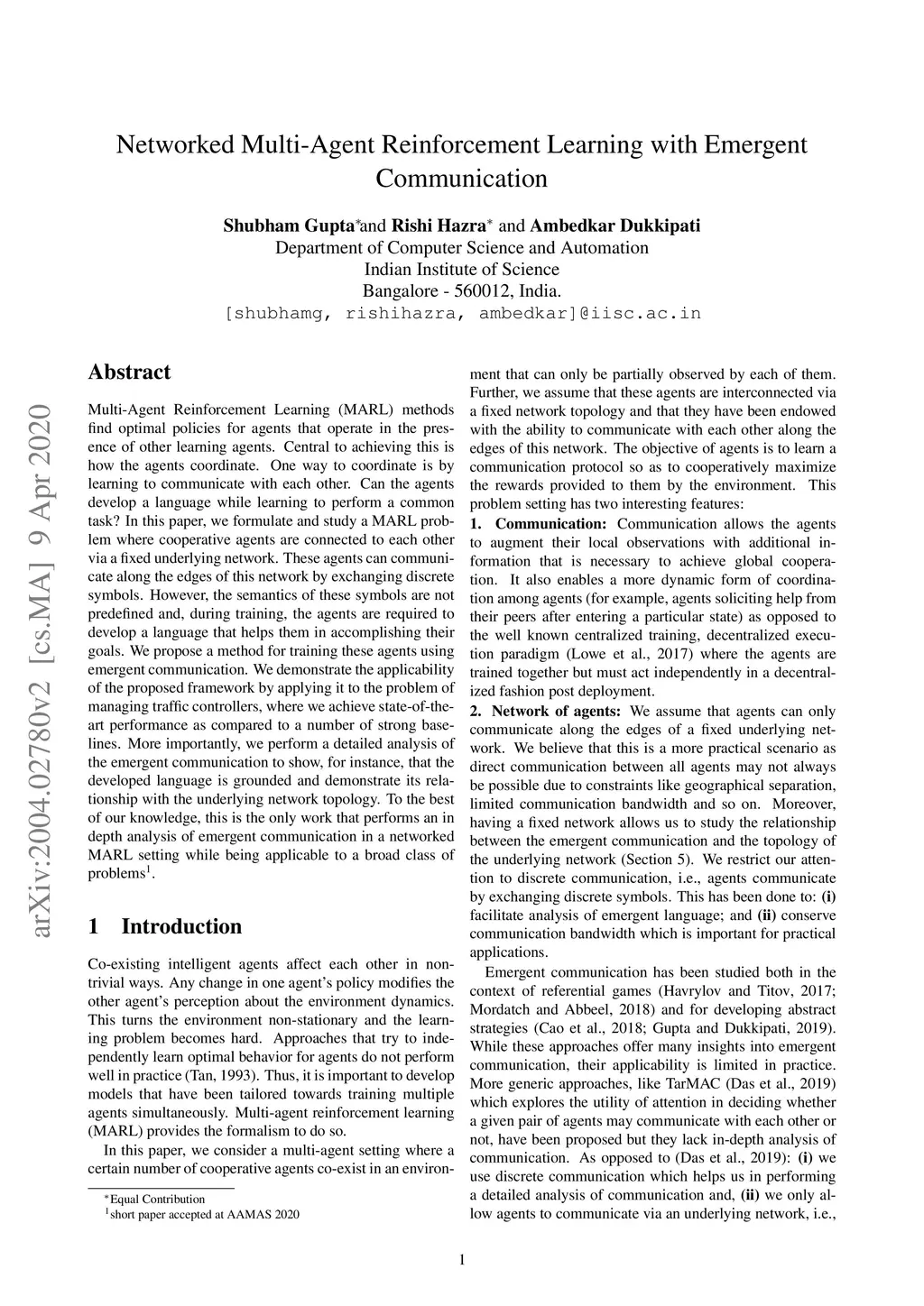 Networked Multi-Agent Reinforcement Learning with Emergent Communication