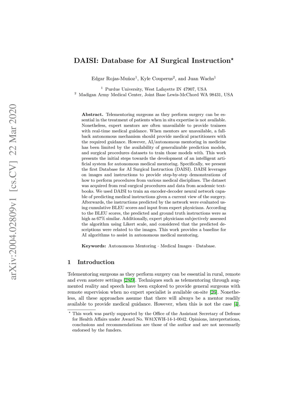 Telementoring surgeons as they perform surgery can be essential in the treatment of patients when in situ expertise is not available. Nonetheless, expert mentors are often unavailable to provide trainees with real-time medical guidance. When mentors are unavailable, a fallback autonomous mechanism should provide medical practitioners with the required guidance. However, AI/autonomous mentoring in medicine has been limited by the availability of generalizable prediction models, and surgical procedures datasets to train those models with. This work presents the initial steps towards the development of an intelligent artificial system for autonomous medical mentoring. Specifically, we present the first Database for AI Surgical Instruction (DAISI). DAISI leverages on images and instructions to provide step-by-step demonstrations of how to perform procedures from various medical disciplines. The dataset was acquired from real surgical procedures and data from academic textbooks. We used DAISI to train an encoder-decoder neural network capable of predicting medical instructions given a current view of the surgery. Afterwards, the instructions predicted by the network were evaluated using cumulative BLEU scores and input from expert physicians. According to the BLEU scores, the predicted and ground truth instructions were as high as 67% similar. Additionally, expert physicians subjectively assessed the algorithm using Likert scale, and considered that the predicted descriptions were related to the images. This work provides a baseline for AI algorithms to assist in autonomous medical mentoring.
