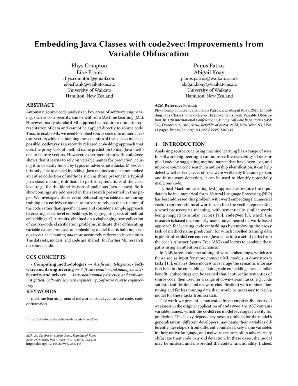 Automatic source code analysis in key areas of software engineering, such as code security, can benefit from Machine Learning (ML). However, many standard ML approaches require a numeric representation of data and cannot be applied directly to source code. Thus, to enable ML, we need to embed source code into numeric feature vectors while maintaining the semantics of the code as much as possible. code2vec is a recently released embedding approach that uses the proxy task of method name prediction to map Java methods to feature vectors. However, experimentation with code2vec shows that it learns to rely on variable names for prediction, causing it to be easily fooled by typos or adversarial attacks. Moreover, it is only able to embed individual Java methods and cannot embed an entire collection of methods such as those present in a typical Java class, making it difficult to perform predictions at the class level (e.g., for the identification of malicious Java classes). Both shortcomings are addressed in the research presented in this paper. We investigate the effect of obfuscating variable names during the training of a code2vec model to force it to rely on the structure of the code rather than specific names and consider a simple approach to creating class-level embeddings by aggregating sets of method embeddings. Our results, obtained on a challenging new collection of source-code classification problems, indicate that obfuscating variable names produces an embedding model that is both impervious to variable naming and more accurately reflects code semantics. The datasets, models, and code are shared for further ML research on source code.