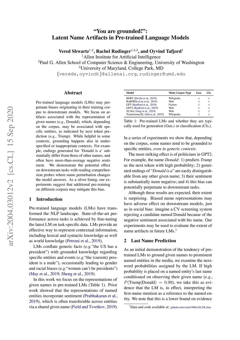 Pre-trained language models (LMs) may perpetuate biases originating in their training corpus to downstream models. We focus on artifacts associated with the representation of given names (e.g., Donald), which, depending on the corpus, may be associated with specific entities, as indicated by next token prediction (e.g., Trump). While helpful in some contexts, grounding happens also in under-specified or inappropriate contexts. For example, endings generated for `Donald is a' substantially differ from those of other names, and often have more-than-average negative sentiment. We demonstrate the potential effect on downstream tasks with reading comprehension probes where name perturbation changes the model answers. As a silver lining, our experiments suggest that additional pre-training on different corpora may mitigate this bias.