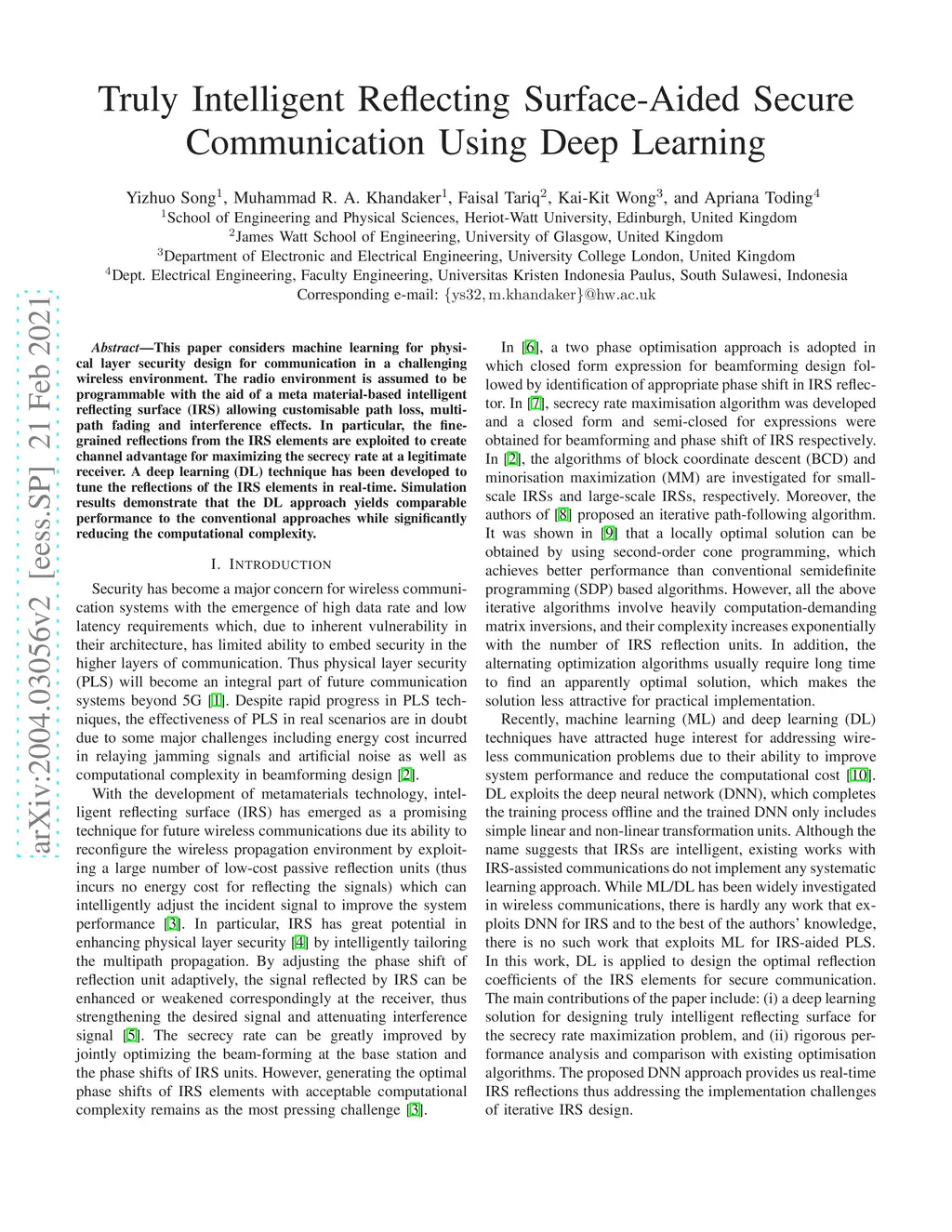This paper considers machine learning for physical layer security design for communication in a challenging wireless environment. The radio environment is assumed to be programmable with the aid of a meta material-based intelligent reflecting surface (IRS) allowing customisable path loss, multi-path fading and interference effects. In particular, the fine-grained reflections from the IRS elements are exploited to create channel advantage for maximizing the secrecy rate at a legitimate receiver. A deep learning (DL) technique has been developed to tune the reflections of the IRS elements in real-time. Simulation results demonstrate that the DL approach yields comparable performance to the conventional approaches while significantly reducing the computational complexity.