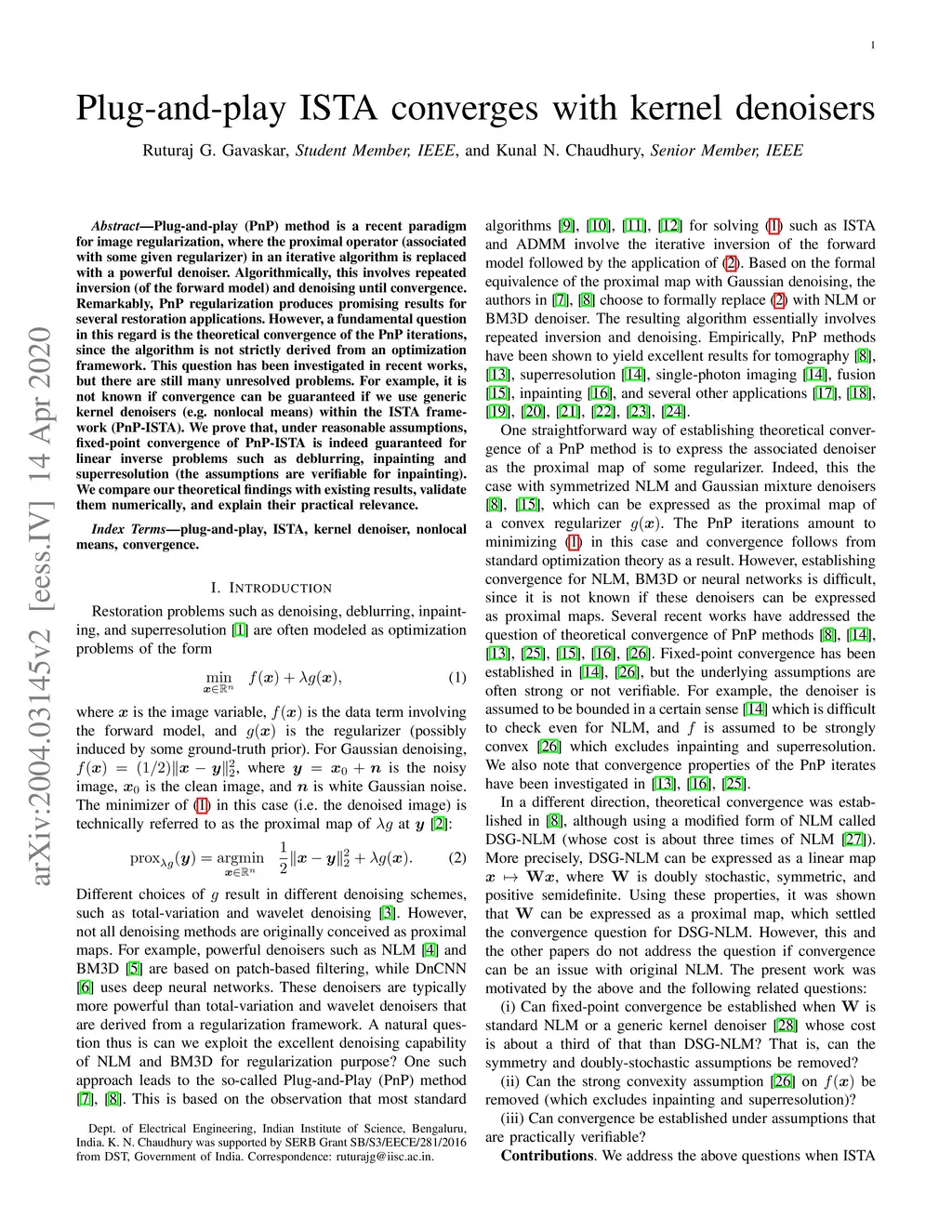 Plug-and-play (PnP) method is a recent paradigm for image regularization, where the proximal operator (associated with some given regularizer) in an iterative algorithm is replaced with a powerful denoiser. Algorithmically, this involves repeated inversion (of the forward model) and denoising until convergence. Remarkably, PnP regularization produces promising results for several restoration applications. However, a fundamental question in this regard is the theoretical convergence of the PnP iterations, since the algorithm is not strictly derived from an optimization framework. This question has been investigated in recent works, but there are still many unresolved problems. For example, it is not known if convergence can be guaranteed if we use generic kernel denoisers (e.g. nonlocal means) within the ISTA framework (PnP-ISTA). We prove that, under reasonable assumptions, fixed-point convergence of PnP-ISTA is indeed guaranteed for linear inverse problems such as deblurring, inpainting and superresolution (the assumptions are verifiable for inpainting). We compare our theoretical findings with existing results, validate them numerically, and explain their practical relevance.