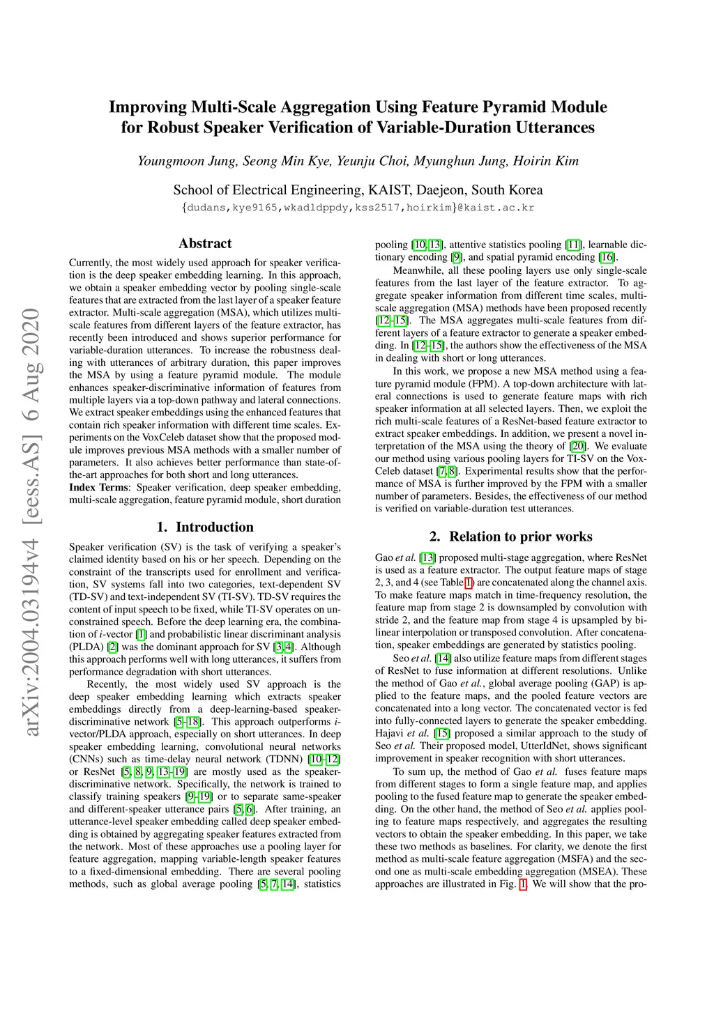 Currently, the most widely used approach for speaker verification is the deep speaker embedding learning. In this approach, we obtain a speaker embedding vector by pooling single-scale features that are extracted from the last layer of a speaker feature extractor. Multi-scale aggregation (MSA), which utilizes multi-scale features from different layers of the feature extractor, has recently been introduced and shows superior performance for variable-duration utterances. To increase the robustness dealing with utterances of arbitrary duration, this paper improves the MSA by using a feature pyramid module. The module enhances speaker-discriminative information of features from multiple layers via a top-down pathway and lateral connections. We extract speaker embeddings using the enhanced features that contain rich speaker information with different time scales. Experiments on the VoxCeleb dataset show that the proposed module improves previous MSA methods with a smaller number of parameters. It also achieves better performance than state-of-the-art approaches for both short and long utterances.