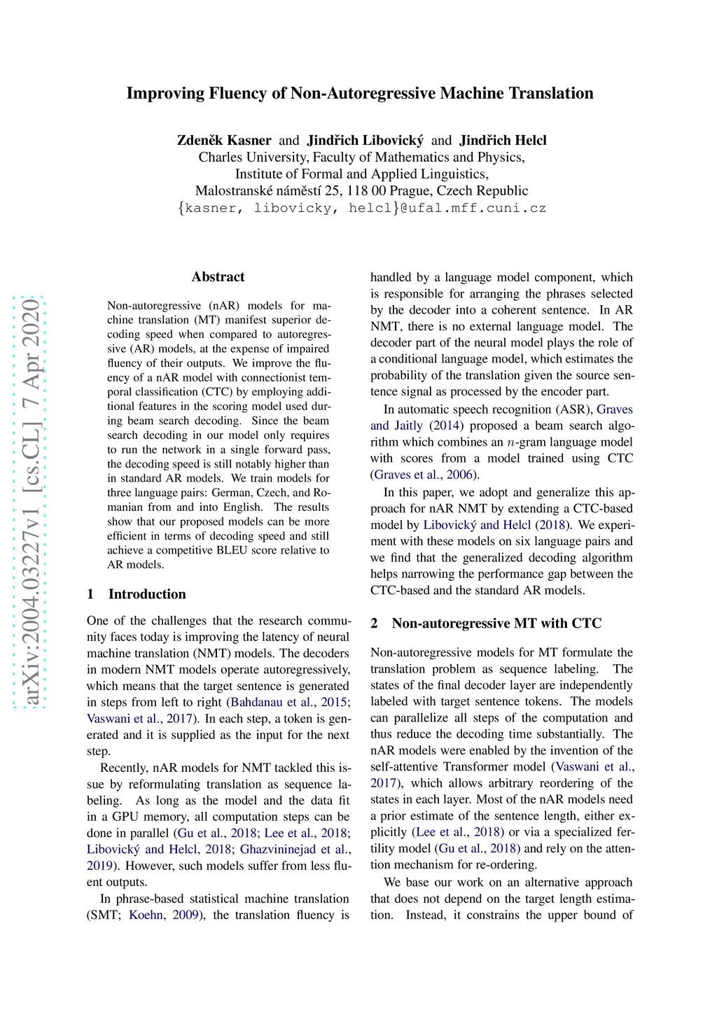 Non-autoregressive (nAR) models for machine translation (MT) manifest superior decoding speed when compared to autoregressive (AR) models, at the expense of impaired fluency of their outputs. We improve the fluency of a nAR model with connectionist temporal classification (CTC) by employing additional features in the scoring model used during beam search decoding. Since the beam search decoding in our model only requires to run the network in a single forward pass, the decoding speed is still notably higher than in standard AR models. We train models for three language pairs: German, Czech, and Romanian from and into English. The results show that our proposed models can be more efficient in terms of decoding speed and still achieve a competitive BLEU score relative to AR models.
