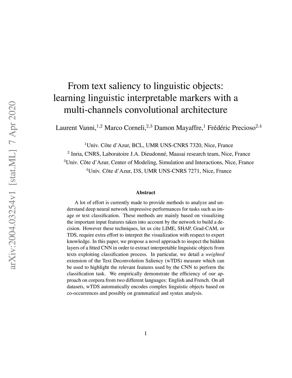 A lot of effort is currently made to provide methods to analyze and understand deep neural network impressive performances for tasks such as image or text classification. These methods are mainly based on visualizing the important input features taken into account by the network to build a decision. However these techniques, let us cite LIME, SHAP, Grad-CAM, or TDS, require extra effort to interpret the visualization with respect to expert knowledge. In this paper, we propose a novel approach to inspect the hidden layers of a fitted CNN in order to extract interpretable linguistic objects from texts exploiting classification process. In particular, we detail a weighted extension of the Text Deconvolution Saliency (wTDS) measure which can be used to highlight the relevant features used by the CNN to perform the classification task. We empirically demonstrate the efficiency of our approach on corpora from two different languages: English and French. On all datasets, wTDS automatically encodes complex linguistic objects based on co-occurrences and possibly on grammatical and syntax analysis.