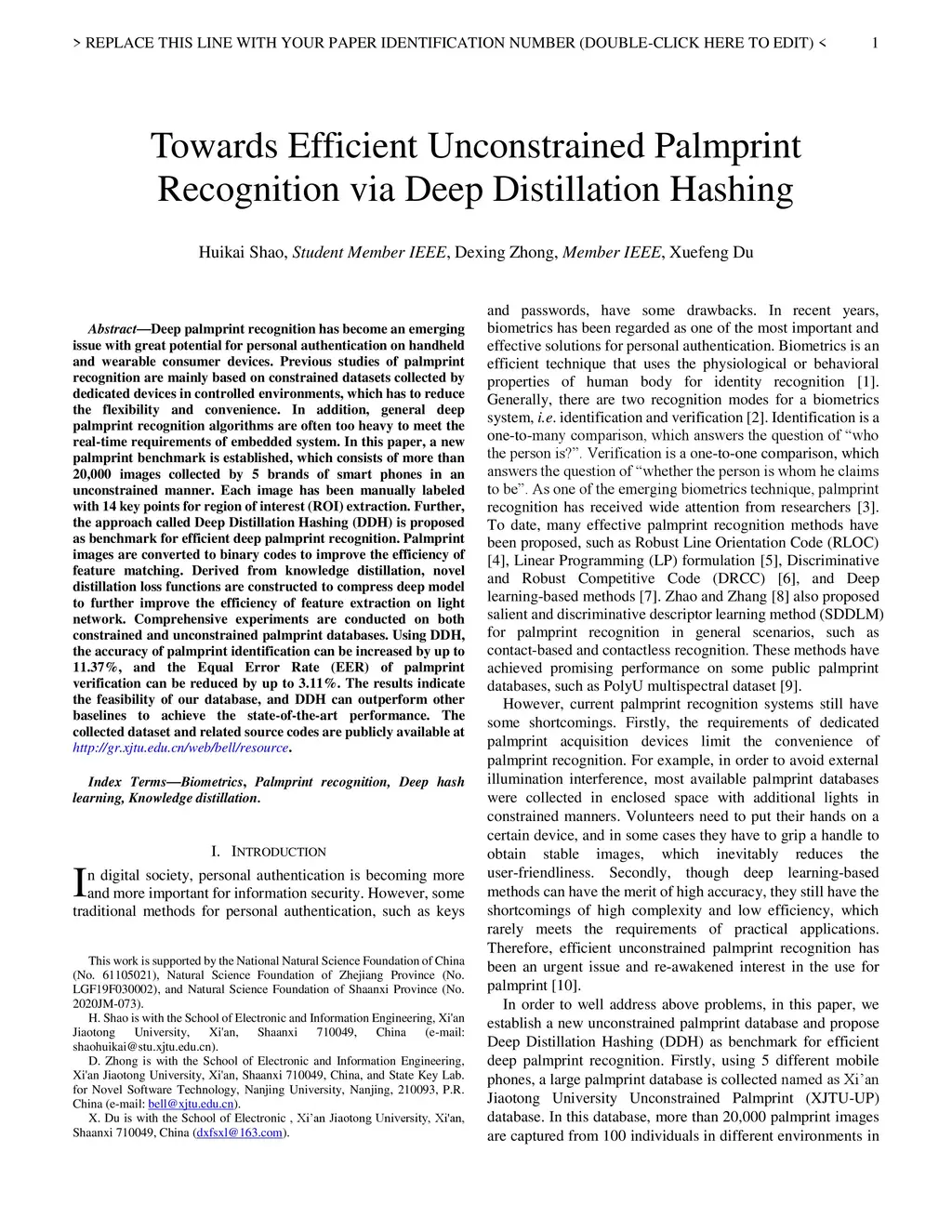 Deep palmprint recognition has become an emerging issue with great potential for personal authentication on handheld and wearable consumer devices. Previous studies of palmprint recognition are mainly based on constrained datasets collected by dedicated devices in controlled environments, which has to reduce the flexibility and convenience. In addition, general deep palmprint recognition algorithms are often too heavy to meet the real-time requirements of embedded system. In this paper, a new palmprint benchmark is established, which consists of more than 20,000 images collected by 5 brands of smart phones in an unconstrained manner. Each image has been manually labeled with 14 key points for region of interest (ROI) extraction. Further, the approach called Deep Distillation Hashing (DDH) is proposed as benchmark for efficient deep palmprint recognition. Palmprint images are converted to binary codes to improve the efficiency of feature matching. Derived from knowledge distillation, novel distillation loss functions are constructed to compress deep model to further improve the efficiency of feature extraction on light network. Comprehensive experiments are conducted on both constrained and unconstrained palmprint databases. Using DDH, the accuracy of palmprint identification can be increased by up to 11.37%, and the Equal Error Rate (EER) of palmprint verification can be reduced by up to 3.11%. The results indicate the feasibility of our database, and DDH can outperform other baselines to achieve the state-of-the-art performance. The collected dataset and related source codes are publicly available at http://gr.xjtu.edu.cn/web/bell/resource.