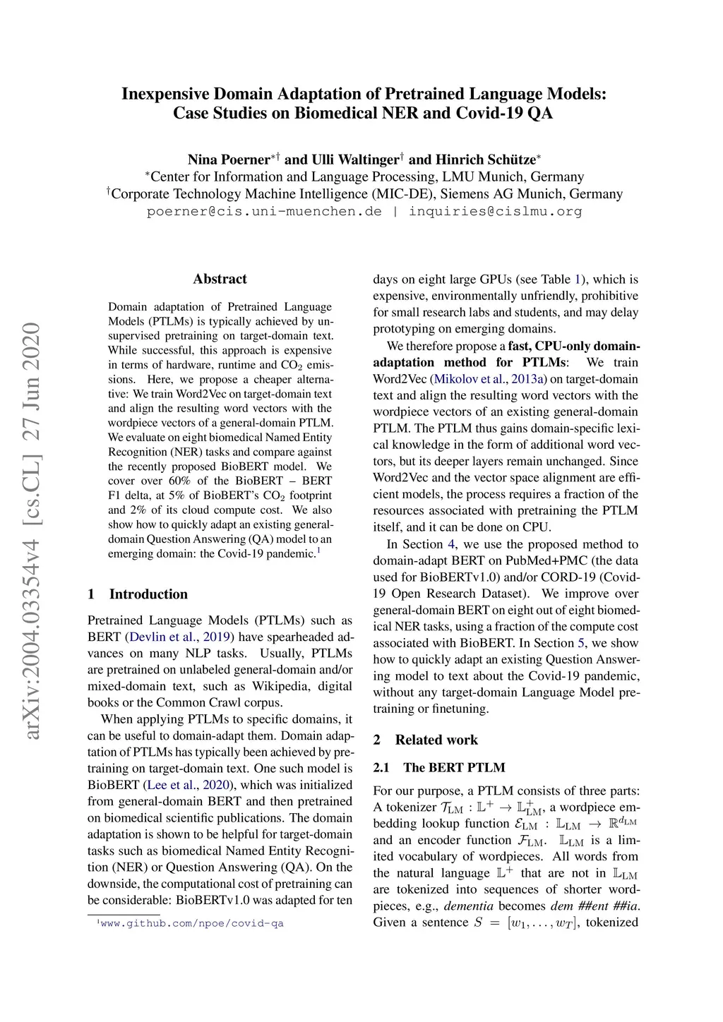 Domain adaptation of Pretrained Language Models (PTLMs) is typically achieved by unsupervised pretraining on target-domain text. While successful, this approach is expensive in terms of hardware, runtime and CO_2 emissions. Here, we propose a cheaper alternative: We train Word2Vec on target-domain text and align the resulting word vectors with the wordpiece vectors of a general-domain PTLM. We evaluate on eight biomedical Named Entity Recognition (NER) tasks and compare against the recently proposed BioBERT model. We cover over 60% of the BioBERT-BERT F1 delta, at 5% of BioBERT's CO_2 footprint and 2% of its cloud compute cost. We also show how to quickly adapt an existing general-domain Question Answering (QA) model to an emerging domain: the Covid-19 pandemic.