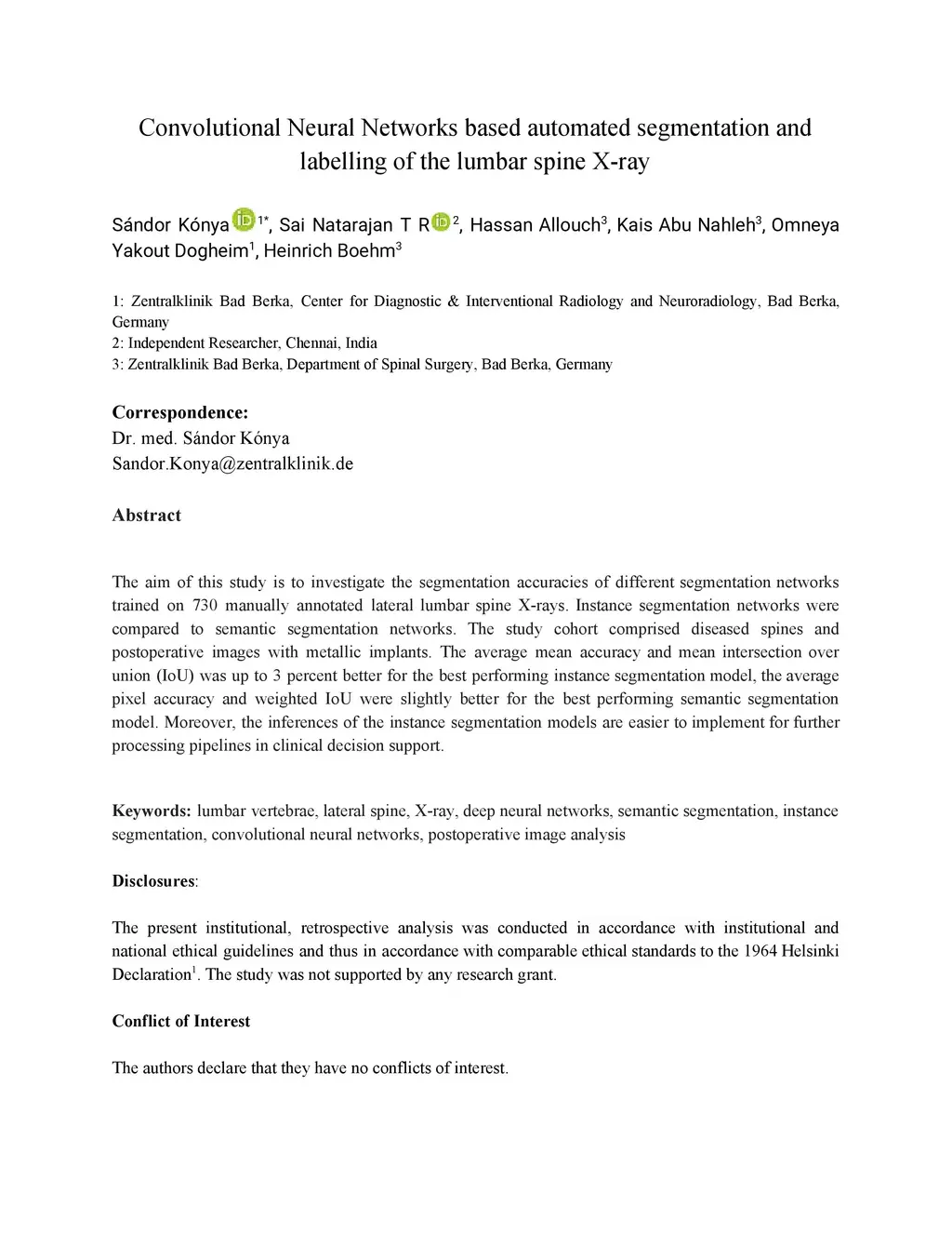 The aim of this study is to investigate the segmentation accuracies of different segmentation networks trained on 730 manually annotated lateral lumbar spine X-rays. Instance segmentation networks were compared to semantic segmentation networks. The study cohort comprised diseased spines and postoperative images with metallic implants. The average mean accuracy and mean intersection over union (IoU) was up to 3 percent better for the best performing instance segmentation model, the average pixel accuracy and weighted IoU were slightly better for the best performing semantic segmentation model. Moreover, the inferences of the instance segmentation models are easier to implement for further processing pipelines in clinical decision support.