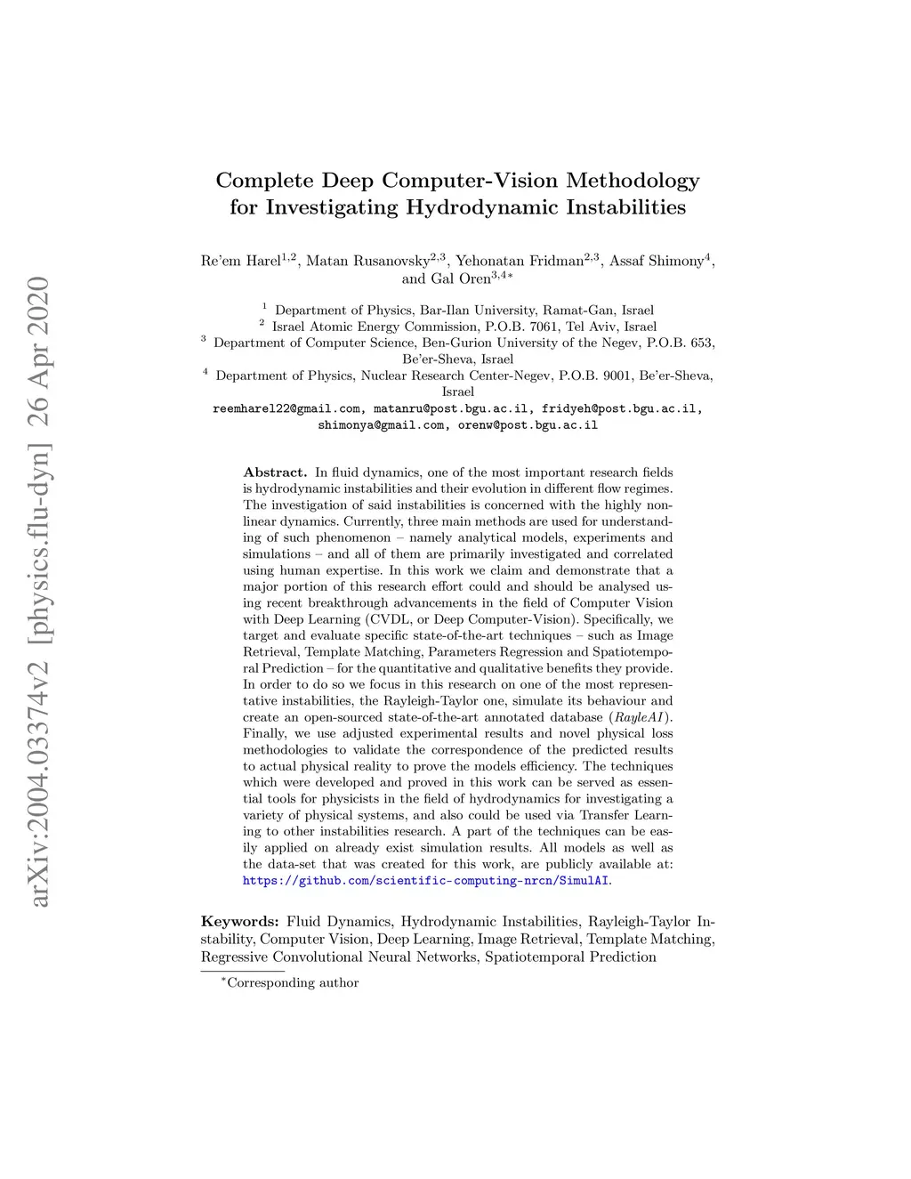 In fluid dynamics, one of the most important research fields is hydrodynamic instabilities and their evolution in different flow regimes. The investigation of said instabilities is concerned with the highly non-linear dynamics. Currently, three main methods are used for understanding of such phenomenon - namely analytical models, experiments and simulations - and all of them are primarily investigated and correlated using human expertise. In this work we claim and demonstrate that a major portion of this research effort could and should be analysed using recent breakthrough advancements in the field of Computer Vision with Deep Learning (CVDL, or Deep Computer-Vision). Specifically, we target and evaluate specific state-of-the-art techniques - such as Image Retrieval, Template Matching, Parameters Regression and Spatiotemporal Prediction - for the quantitative and qualitative benefits they provide. In order to do so we focus in this research on one of the most representative instabilities, the Rayleigh-Taylor one, simulate its behaviour and create an open-sourced state-of-the-art annotated database (RayleAI). Finally, we use adjusted experimental results and novel physical loss methodologies to validate the correspondence of the predicted results to actual physical reality to prove the models efficiency. The techniques which were developed and proved in this work can be served as essential tools for physicists in the field of hydrodynamics for investigating a variety of physical systems, and also could be used via Transfer Learning to other instabilities research. A part of the techniques can be easily applied on already exist simulation results. All models as well as the data-set that was created for this work, are publicly available at: https://github.com/scientific-computing-nrcn/SimulAI.