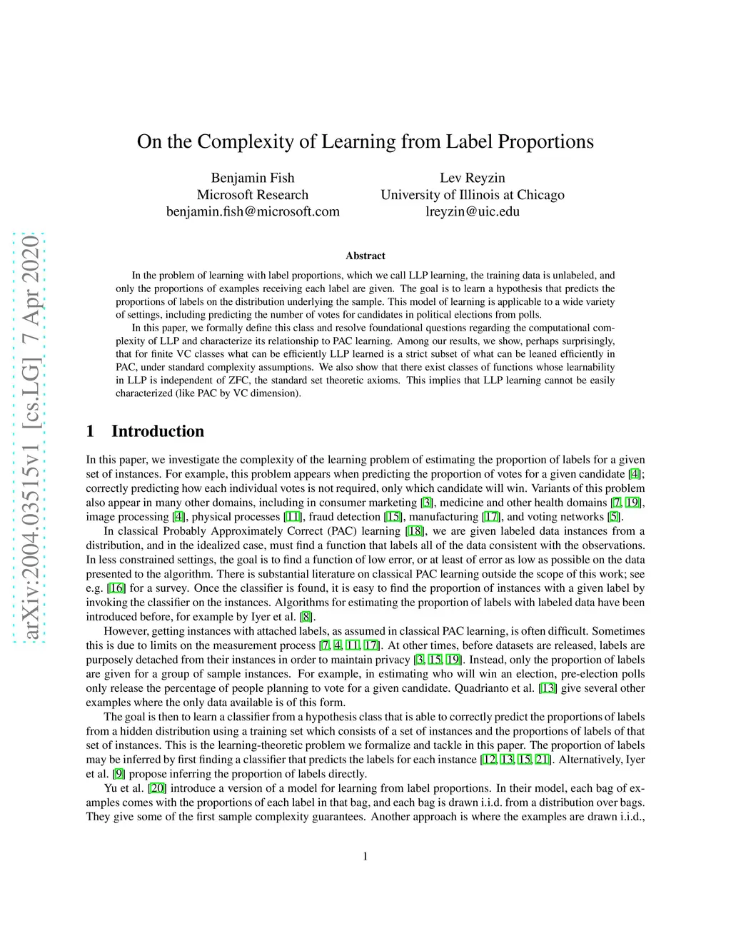 In the problem of learning with label proportions, which we call LLP learning, the training data is unlabeled, and only the proportions of examples receiving each label are given. The goal is to learn a hypothesis that predicts the proportions of labels on the distribution underlying the sample. This model of learning is applicable to a wide variety of settings, including predicting the number of votes for candidates in political elections from polls. In this paper, we formally define this class and resolve foundational questions regarding the computational complexity of LLP and characterize its relationship to PAC learning. Among our results, we show, perhaps surprisingly, that for finite VC classes what can be efficiently LLP learned is a strict subset of what can be leaned efficiently in PAC, under standard complexity assumptions. We also show that there exist classes of functions whose learnability in LLP is independent of ZFC, the standard set theoretic axioms. This implies that LLP learning cannot be easily characterized (like PAC by VC dimension).