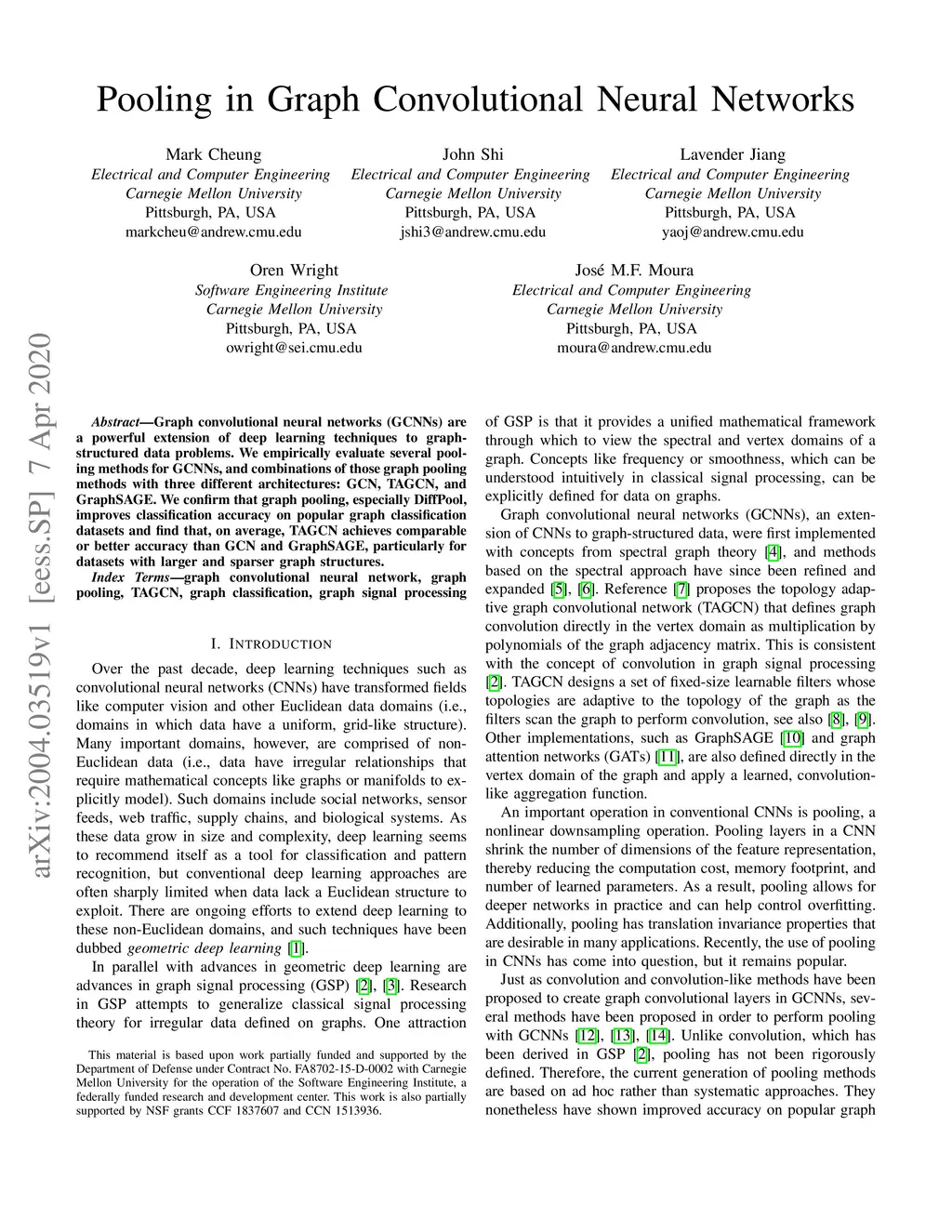Graph convolutional neural networks (GCNNs) are a powerful extension of deep learning techniques to graph-structured data problems. We empirically evaluate several pooling methods for GCNNs, and combinations of those graph pooling methods with three different architectures: GCN, TAGCN, and GraphSAGE. We confirm that graph pooling, especially DiffPool, improves classification accuracy on popular graph classification datasets and find that, on average, TAGCN achieves comparable or better accuracy than GCN and GraphSAGE, particularly for datasets with larger and sparser graph structures.