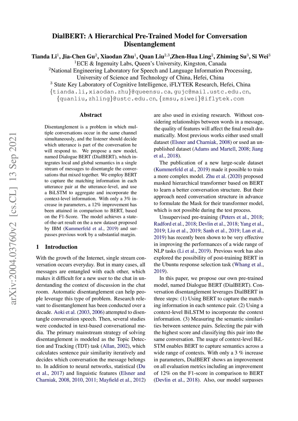 Disentanglement is a problem in which multiple conversations occur in the same channel simultaneously, and the listener should decide which utterance is part of the conversation he will respond to. We propose a new model, named Dialogue BERT (DialBERT), which integrates local and global semantics in a single stream of messages to disentangle the conversations that mixed together. We employ BERT to capture the matching information in each utterance pair at the utterance-level, and use a BiLSTM to aggregate and incorporate the context-level information. With only a 3% increase in parameters, a 12% improvement has been attained in comparison to BERT, based on the F1-Score. The model achieves a state-of-the-art result on the a new dataset proposed by IBM and surpasses previous work by a substantial margin.