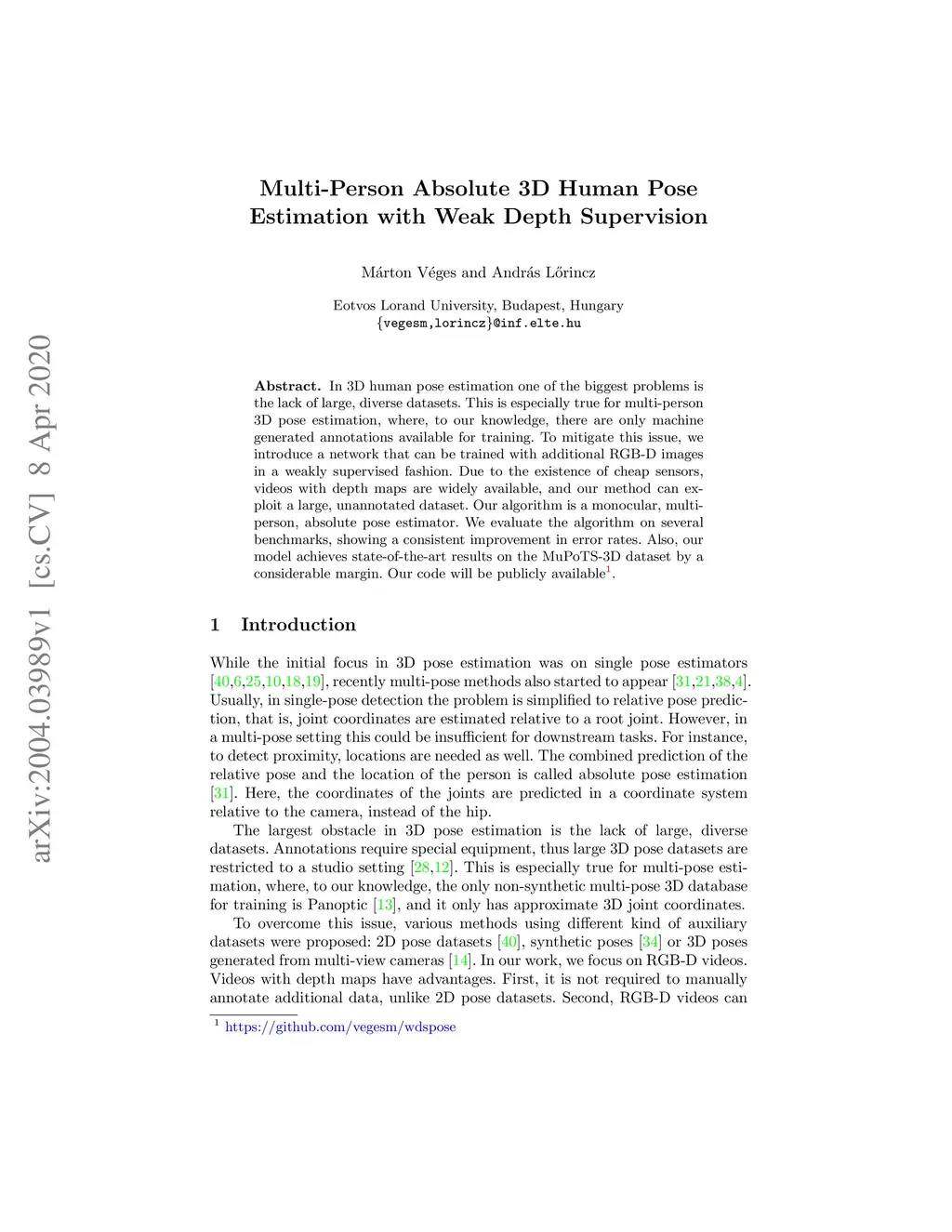 In 3D human pose estimation one of the biggest problems is the lack of large, diverse datasets. This is especially true for multi-person 3D pose estimation, where, to our knowledge, there are only machine generated annotations available for training. To mitigate this issue, we introduce a network that can be trained with additional RGB-D images in a weakly supervised fashion. Due to the existence of cheap sensors, videos with depth maps are widely available, and our method can exploit a large, unannotated dataset. Our algorithm is a monocular, multi-person, absolute pose estimator. We evaluate the algorithm on several benchmarks, showing a consistent improvement in error rates. Also, our model achieves state-of-the-art results on the MuPoTS-3D dataset by a considerable margin.