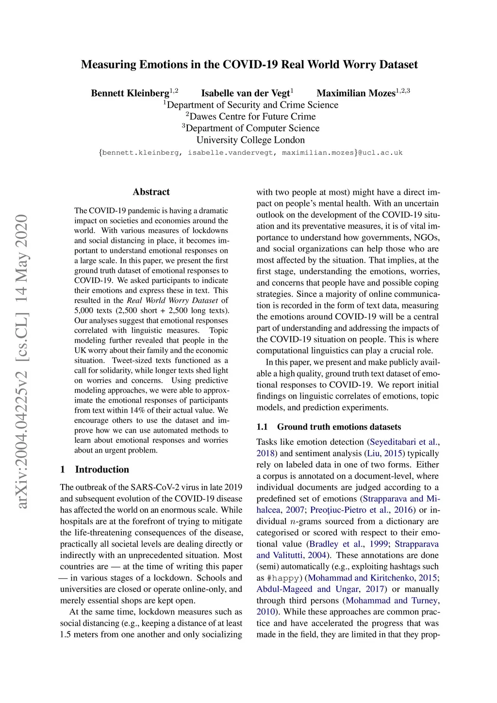 The COVID-19 pandemic is having a dramatic impact on societies and economies around the world. With various measures of lockdowns and social distancing in place, it becomes important to understand emotional responses on a large scale. In this paper, we present the first ground truth dataset of emotional responses to COVID-19. We asked participants to indicate their emotions and express these in text. This resulted in the Real World Worry Dataset of 5,000 texts (2,500 short + 2,500 long texts). Our analyses suggest that emotional responses correlated with linguistic measures. Topic modeling further revealed that people in the UK worry about their family and the economic situation. Tweet-sized texts functioned as a call for solidarity, while longer texts shed light on worries and concerns. Using predictive modeling approaches, we were able to approximate the emotional responses of participants from text within 14% of their actual value. We encourage others to use the dataset and improve how we can use automated methods to learn about emotional responses and worries about an urgent problem.