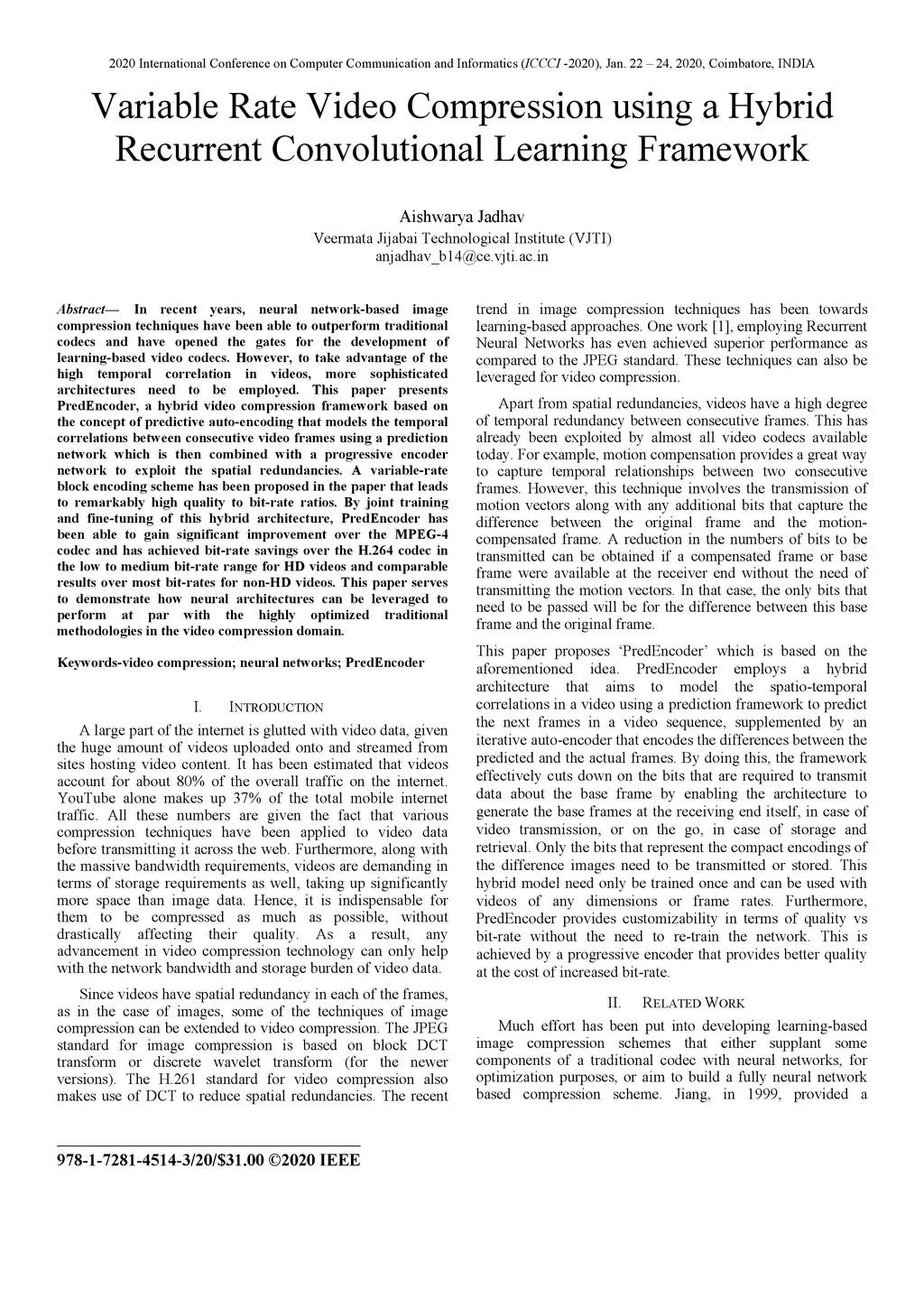Variable Rate Video Compression using a Hybrid Recurrent Convolutional