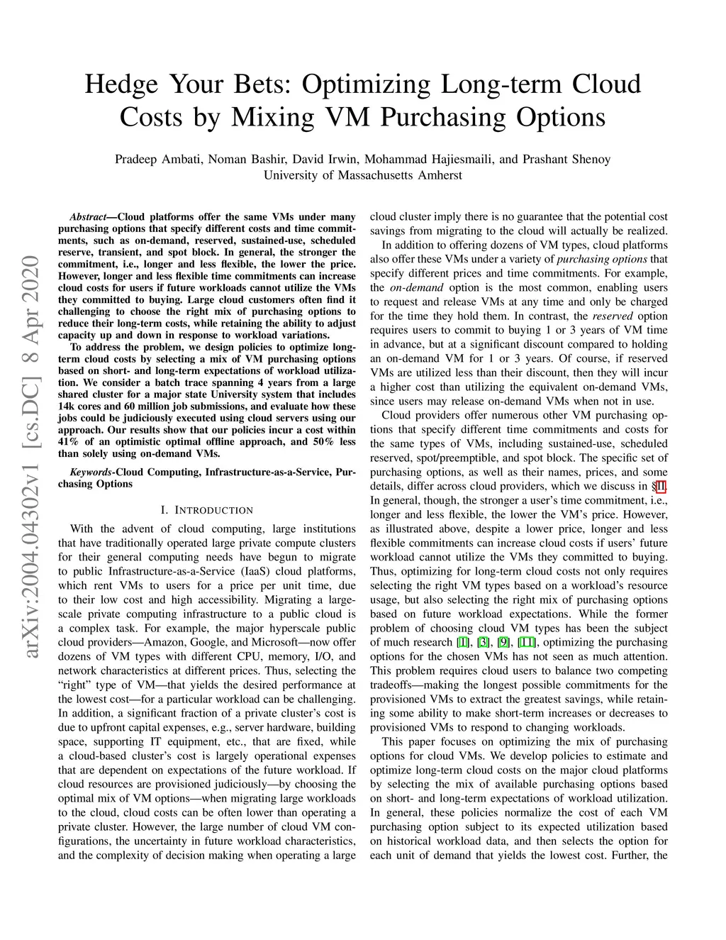 Cloud platforms offer the same VMs under many purchasing options that specify different costs and time commitments, such as on-demand, reserved, sustained-use, scheduled reserve, transient, and spot block. In general, the stronger the commitment, i.e., longer and less flexible, the lower the price. However, longer and less flexible time commitments can increase cloud costs for users if future workloads cannot utilize the VMs they committed to buying. Large cloud customers often find it challenging to choose the right mix of purchasing options to reduce their long-term costs, while retaining the ability to adjust capacity up and down in response to workload variations. To address the problem, we design policies to optimize long-term cloud costs by selecting a mix of VM purchasing options based on short- and long-term expectations of workload utilization. We consider a batch trace spanning 4 years from a large shared cluster for a major state University system that includes 14k cores and 60 million job submissions, and evaluate how these jobs could be judiciously executed using cloud servers using our approach. Our results show that our policies incur a cost within 41% of an optimistic optimal offline approach, and 50% less than solely using on-demand VMs.