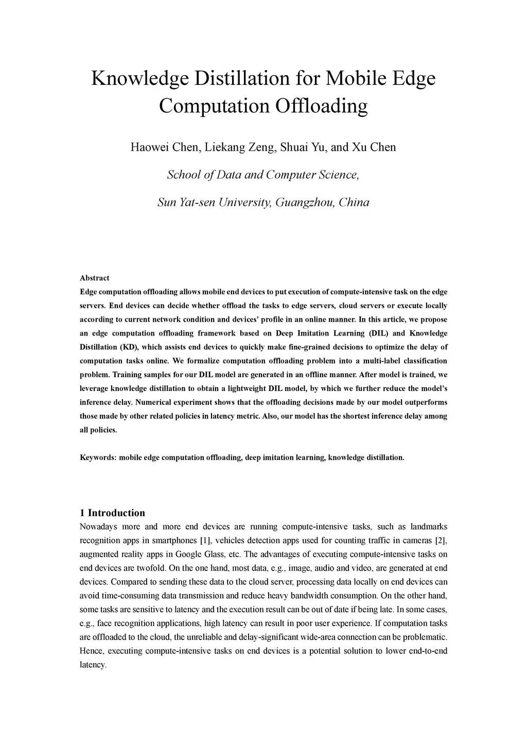 Edge computation offloading allows mobile end devices to put execution of compute-intensive task on the edge servers. End devices can decide whether offload the tasks to edge servers, cloud servers or execute locally according to current network condition and devices' profile in an online manner. In this article, we propose an edge computation offloading framework based on Deep Imitation Learning (DIL) and Knowledge Distillation (KD), which assists end devices to quickly make fine-grained decisions to optimize the delay of computation tasks online. We formalize computation offloading problem into a multi-label classification problem. Training samples for our DIL model are generated in an offline manner. After model is trained, we leverage knowledge distillation to obtain a lightweight DIL model, by which we further reduce the model's inference delay. Numerical experiment shows that the offloading decisions made by our model outperforms those made by other related policies in latency metric. Also, our model has the shortest inference delay among all policies.