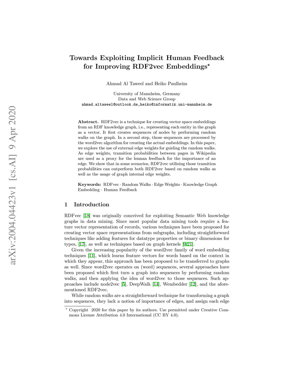 Towards Exploiting Implicit Human Feedback for Improving RDF2vec