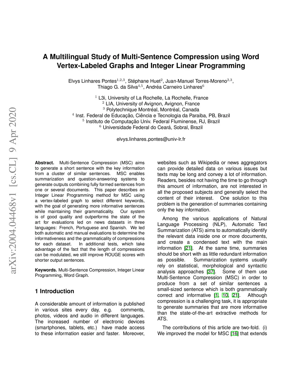 Multi-Sentence Compression (MSC) aims to generate a short sentence with the key information from a cluster of similar sentences. MSC enables summarization and question-answering systems to generate outputs combining fully formed sentences from one or several documents. This paper describes an Integer Linear Programming method for MSC using a vertex-labeled graph to select different keywords, with the goal of generating more informative sentences while maintaining their grammaticality. Our system is of good quality and outperforms the state of the art for evaluations led on news datasets in three languages: French, Portuguese and Spanish. We led both automatic and manual evaluations to determine the informativeness and the grammaticality of compressions for each dataset. In additional tests, which take advantage of the fact that the length of compressions can be modulated, we still improve ROUGE scores with shorter output sentences.