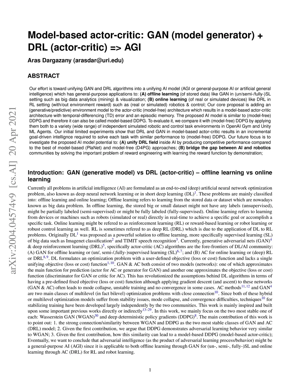 Our effort is toward unifying GAN and DRL algorithms into a unifying AI model (AGI or general-purpose AI or artificial general intelligence which has general-purpose applications to: (A) offline learning (of stored data) like GAN in (un/semi-/fully-)SL setting such as big data analytics (mining) and visualization; (B) online learning (of real or simulated devices) like DRL in RL setting (with/out environment reward) such as (real or simulated) robotics and control; Our core proposal is adding an (generative/predictive) environment model to the actor-critic (model-free) architecture which results in a model-based actor-critic architecture with temporal-differencing (TD) error and an episodic memory. The proposed AI model is similar to (model-free) DDPG and therefore it's called model-based DDPG. To evaluate it, we compare it with (model-free) DDPG by applying them both to a variety (wide range) of independent simulated robotic and control task environments in OpenAI Gym and Unity Agents. Our initial limited experiments show that DRL and GAN in model-based actor-critic results in an incremental goal-driven intellignce required to solve each task with similar performance to (model-free) DDPG. Our future focus is to investigate the proposed AI model potential to: (A) unify DRL field inside AI by producing competitive performance compared to the best of model-based (PlaNet) and model-free (D4PG) approaches; (B) bridge the gap between AI and robotics communities by solving the important problem of reward engineering with learning the reward function by demonstration.