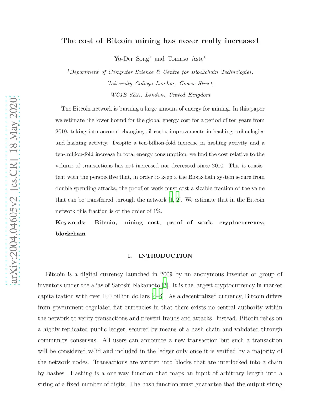 The Bitcoin network is burning a large amount of energy for mining. In this paper we estimate the lower bound for the global energy cost for a period of ten years from 2010, taking into account changing oil costs, improvements in hashing technologies and hashing activity. Despite a ten-billion-fold increase in hashing activity and a ten-million-fold increase in total energy consumption, we find the cost relative to the volume of transactions has not increased nor decreased since 2010. This is consistent with the perspective that, in order to keep a the Blockchain system secure from double spending attacks, the proof or work must cost a sizable fraction of the value that can be transferred through the network. We estimate that in the Bitcoin network this fraction is of the order of 1%.