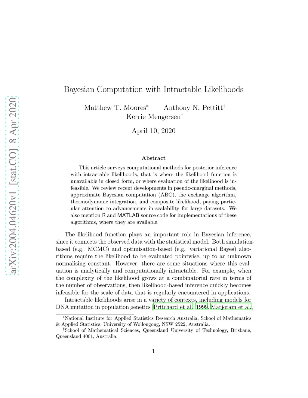 This article surveys computational methods for posterior inference with intractable likelihoods, that is where the likelihood function is unavailable in closed form, or where evaluation of the likelihood is infeasible. We review recent developments in pseudo-marginal methods, approximate Bayesian computation (ABC), the exchange algorithm, thermodynamic integration, and composite likelihood, paying particular attention to advancements in scalability for large datasets. We also mention R and MATLAB source code for implementations of these algorithms, where they are available.