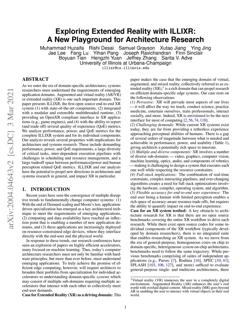 As we enter the era of domain-specific architectures, systems researchers must understand the requirements of emerging application domains. Augmented and virtual reality (AR/VR) or extended reality (XR) is one such important domain. This paper presents ILLIXR, the first open source end-to-end XR system (1) with state-of-the-art components, (2) integrated with a modular and extensible multithreaded runtime, (3) providing an OpenXR compliant interface to XR applications (e.g., game engines), and (4) with the ability to report (and trade off) several quality of experience (QoE) metrics. We analyze performance, power, and QoE metrics for the complete ILLIXR system and for its individual components. Our analysis reveals several properties with implications for architecture and systems research. These include demanding performance, power, and QoE requirements, a large diversity of critical tasks, inter-dependent execution pipelines with challenges in scheduling and resource management, and a large tradeoff space between performance/power and human perception related QoE metrics. ILLIXR and our analysis have the potential to propel new directions in architecture and systems research in general, and impact XR in particular. ILLIXR is open-source and available at https://illixr.github.io