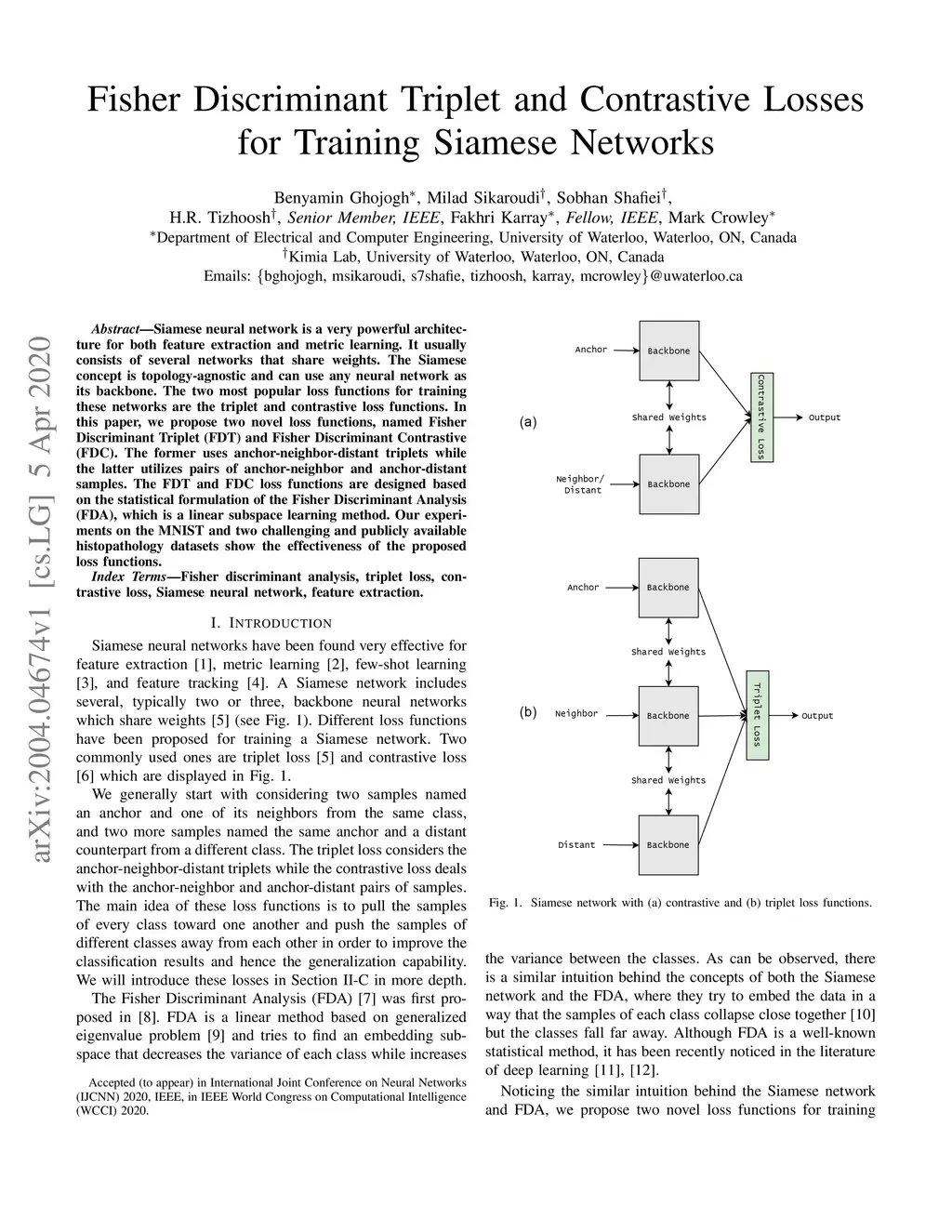Fisher Discriminant Triplet and Contrastive Losses for Training Siamese