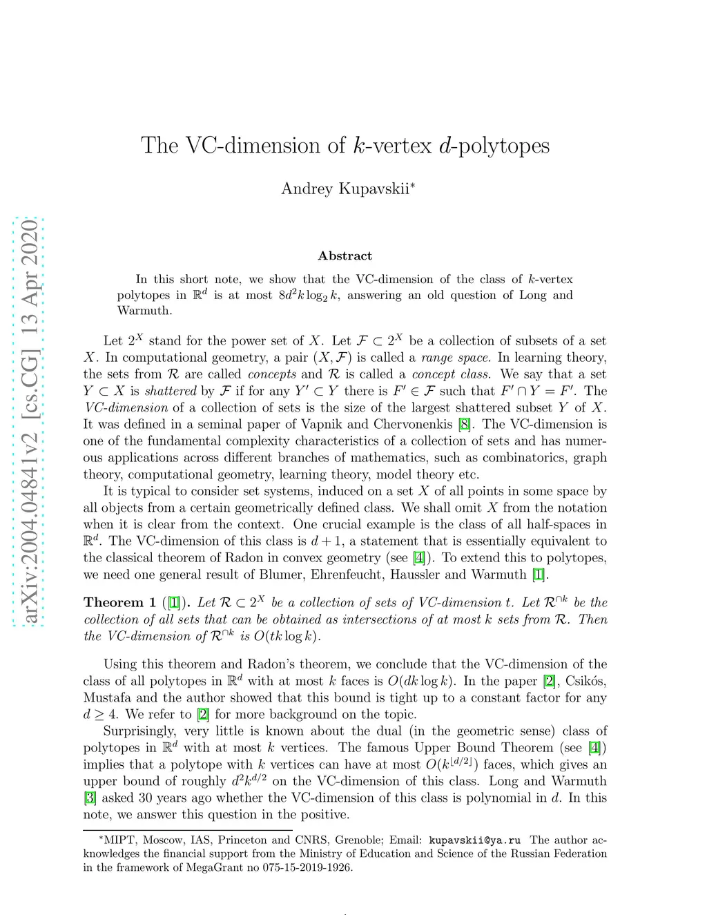In this short note, we show that the VC-dimension of the class of -vertex polytopes in is at most , answering an old question of Long and Warmuth.
