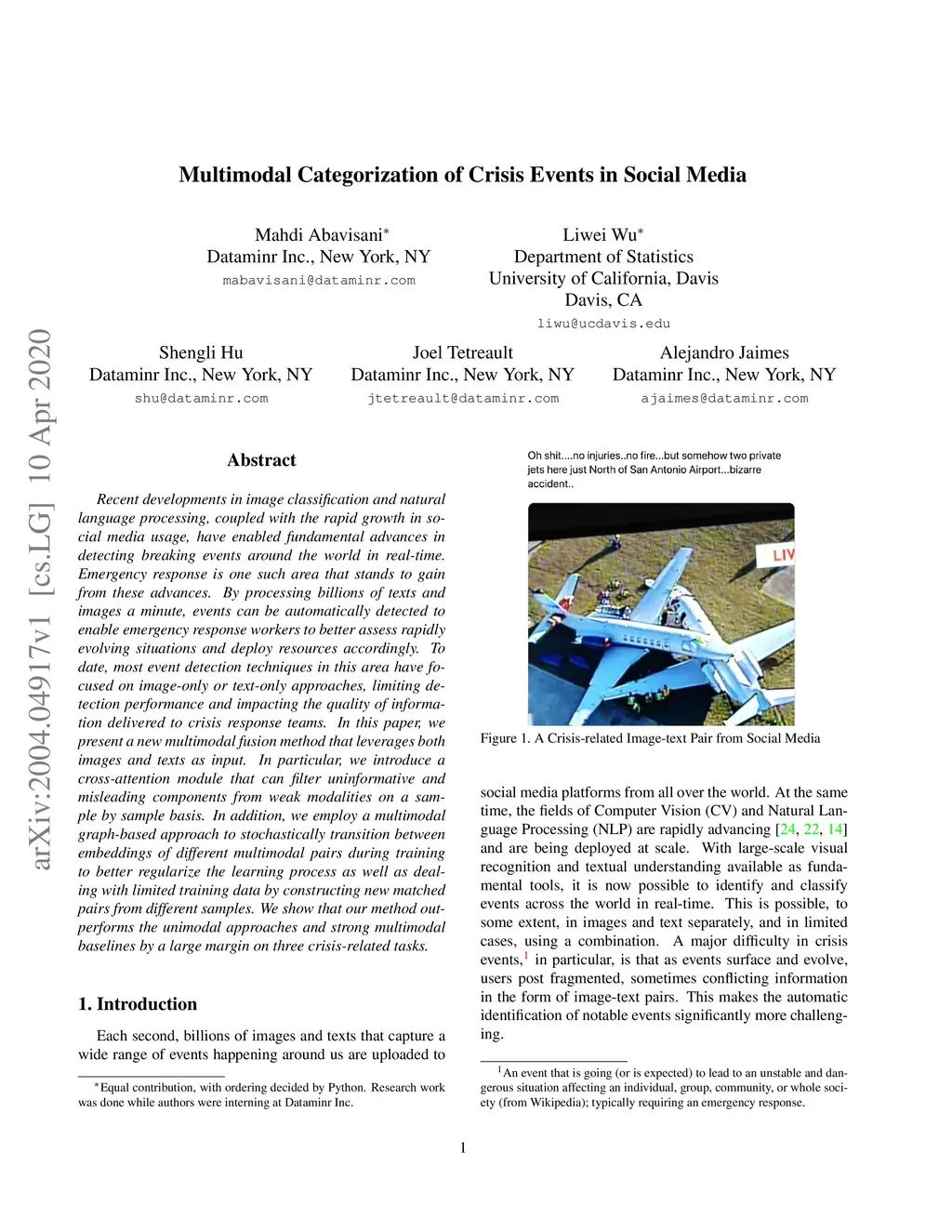 Recent developments in image classification and natural language processing, coupled with the rapid growth in social media usage, have enabled fundamental advances in detecting breaking events around the world in real-time. Emergency response is one such area that stands to gain from these advances. By processing billions of texts and images a minute, events can be automatically detected to enable emergency response workers to better assess rapidly evolving situations and deploy resources accordingly. To date, most event detection techniques in this area have focused on image-only or text-only approaches, limiting detection performance and impacting the quality of information delivered to crisis response teams. In this paper, we present a new multimodal fusion method that leverages both images and texts as input. In particular, we introduce a cross-attention module that can filter uninformative and misleading components from weak modalities on a sample by sample basis. In addition, we employ a multimodal graph-based approach to stochastically transition between embeddings of different multimodal pairs during training to better regularize the learning process as well as dealing with limited training data by constructing new matched pairs from different samples. We show that our method outperforms the unimodal approaches and strong multimodal baselines by a large margin on three crisis-related tasks.