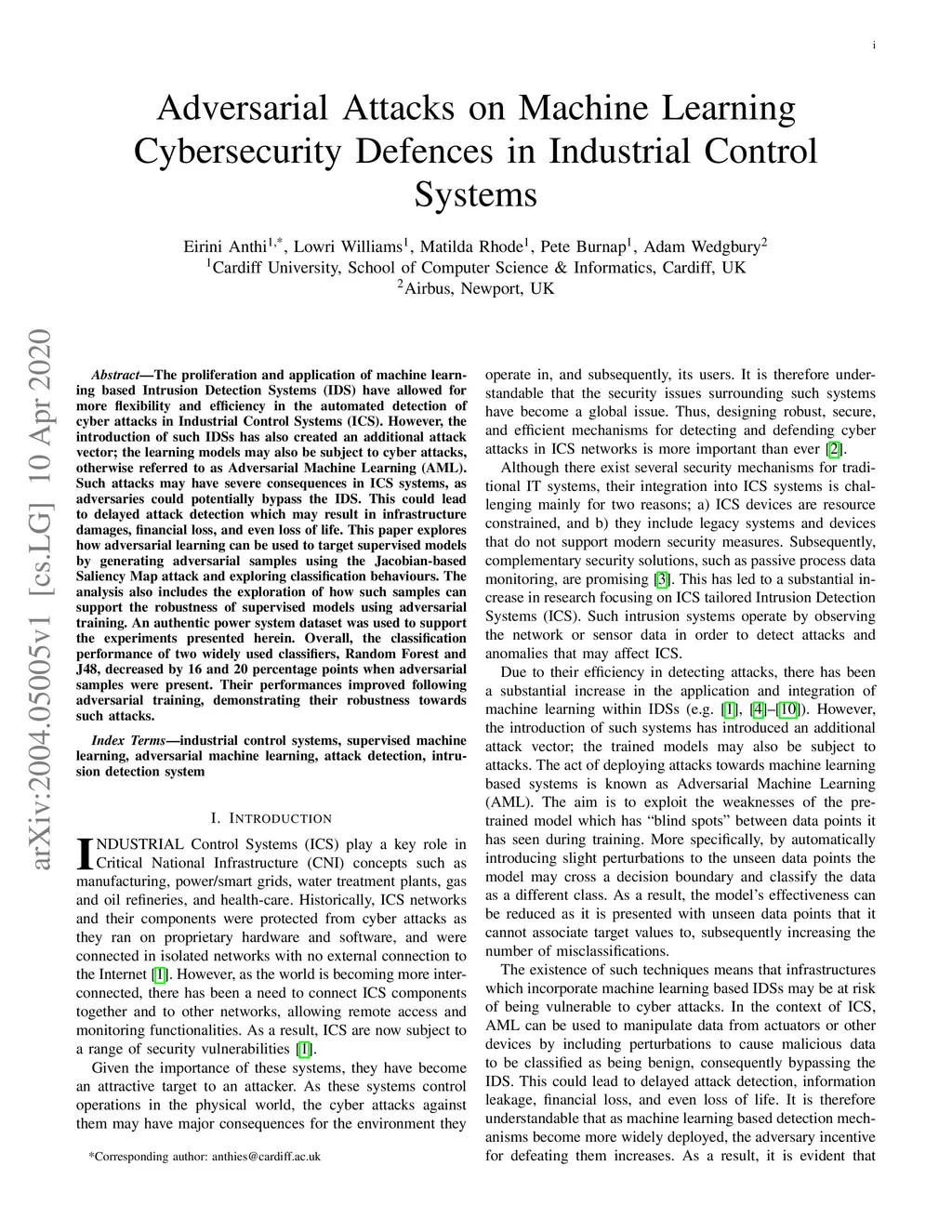 The proliferation and application of machine learning based Intrusion Detection Systems (IDS) have allowed for more flexibility and efficiency in the automated detection of cyber attacks in Industrial Control Systems (ICS). However, the introduction of such IDSs has also created an additional attack vector; the learning models may also be subject to cyber attacks, otherwise referred to as Adversarial Machine Learning (AML). Such attacks may have severe consequences in ICS systems, as adversaries could potentially bypass the IDS. This could lead to delayed attack detection which may result in infrastructure damages, financial loss, and even loss of life. This paper explores how adversarial learning can be used to target supervised models by generating adversarial samples using the Jacobian-based Saliency Map attack and exploring classification behaviours. The analysis also includes the exploration of how such samples can support the robustness of supervised models using adversarial training. An authentic power system dataset was used to support the experiments presented herein. Overall, the classification performance of two widely used classifiers, Random Forest and J48, decreased by 16 and 20 percentage points when adversarial samples were present. Their performances improved following adversarial training, demonstrating their robustness towards such attacks.