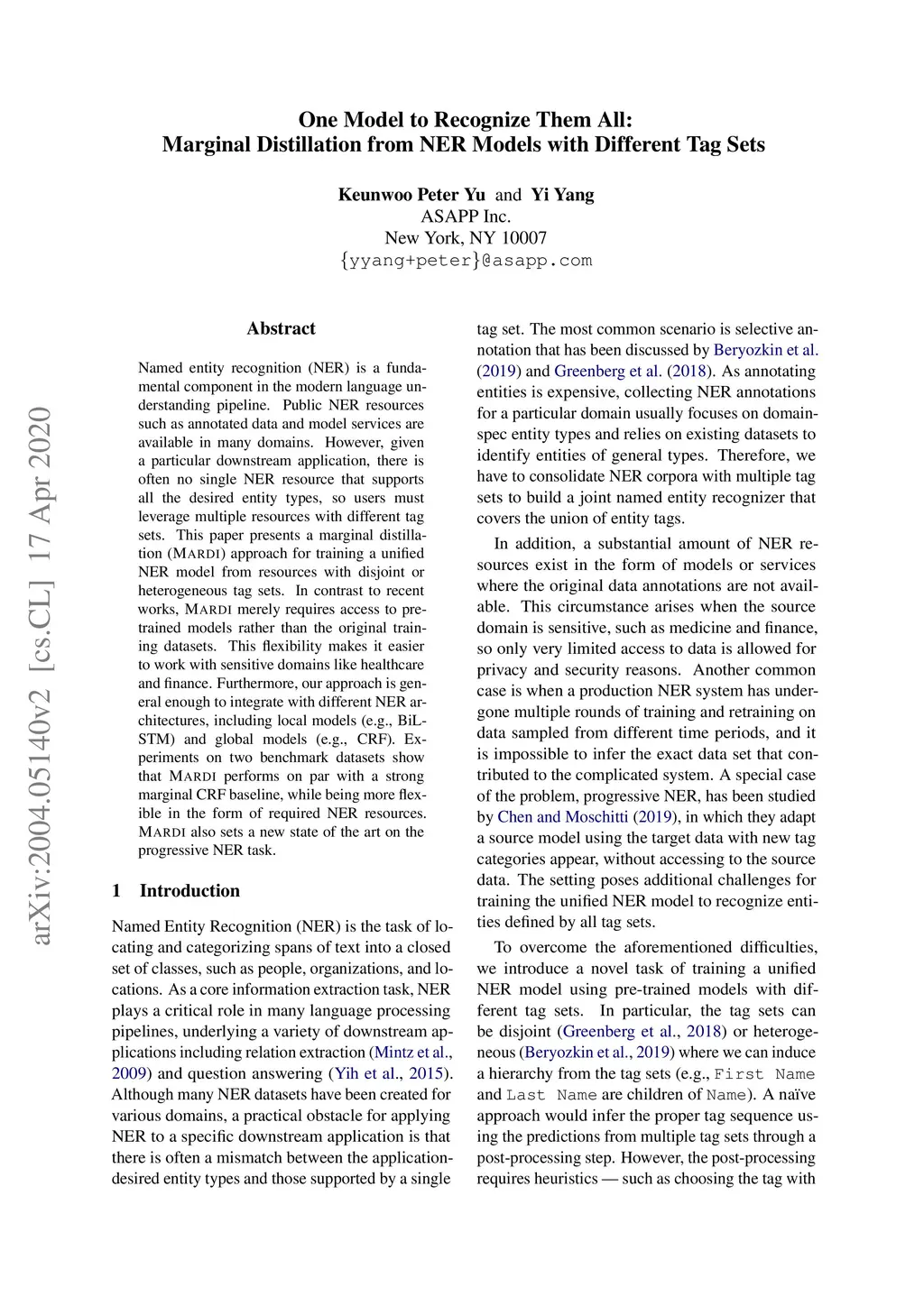 Named entity recognition (NER) is a fundamental component in the modern language understanding pipeline. Public NER resources such as annotated data and model services are available in many domains. However, given a particular downstream application, there is often no single NER resource that supports all the desired entity types, so users must leverage multiple resources with different tag sets. This paper presents a marginal distillation (MARDI) approach for training a unified NER model from resources with disjoint or heterogeneous tag sets. In contrast to recent works, MARDI merely requires access to pre-trained models rather than the original training datasets. This flexibility makes it easier to work with sensitive domains like healthcare and finance. Furthermore, our approach is general enough to integrate with different NER architectures, including local models (e.g., BiLSTM) and global models (e.g., CRF). Experiments on two benchmark datasets show that MARDI performs on par with a strong marginal CRF baseline, while being more flexible in the form of required NER resources. MARDI also sets a new state of the art on the progressive NER task. MARDI significantly outperforms the start-of-the-art model on the task of progressive NER.