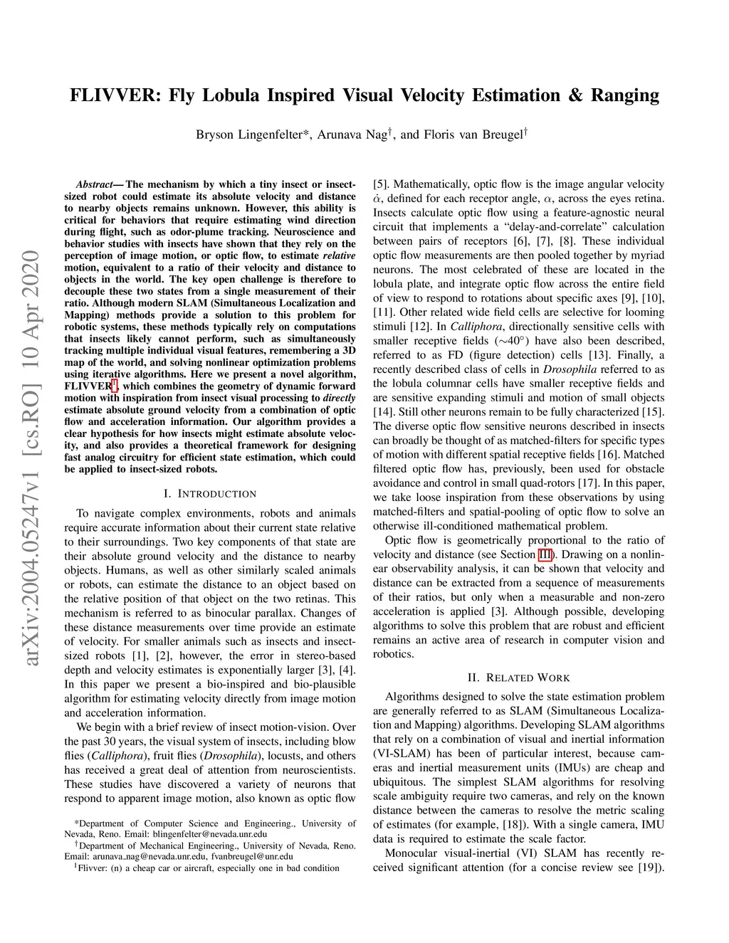 The mechanism by which a tiny insect or insect-sized robot could estimate its absolute velocity and distance to nearby objects remains unknown. However, this ability is critical for behaviors that require estimating wind direction during flight, such as odor-plume tracking. Neuroscience and behavior studies with insects have shown that they rely on the perception of image motion, or optic flow, to estimate relative motion, equivalent to a ratio of their velocity and distance to objects in the world. The key open challenge is therefore to decouple these two states from a single measurement of their ratio. Although modern SLAM (Simultaneous Localization and Mapping) methods provide a solution to this problem for robotic systems, these methods typically rely on computations that insects likely cannot perform, such as simultaneously tracking multiple individual visual features, remembering a 3D map of the world, and solving nonlinear optimization problems using iterative algorithms. Here we present a novel algorithm, FLIVVER, which combines the geometry of dynamic forward motion with inspiration from insect visual processing to \textit{directly} estimate absolute ground velocity from a combination of optic flow and acceleration information. Our algorithm provides a clear hypothesis for how insects might estimate absolute velocity, and also provides a theoretical framework for designing fast analog circuitry for efficient state estimation, which could be applied to insect-sized robots.