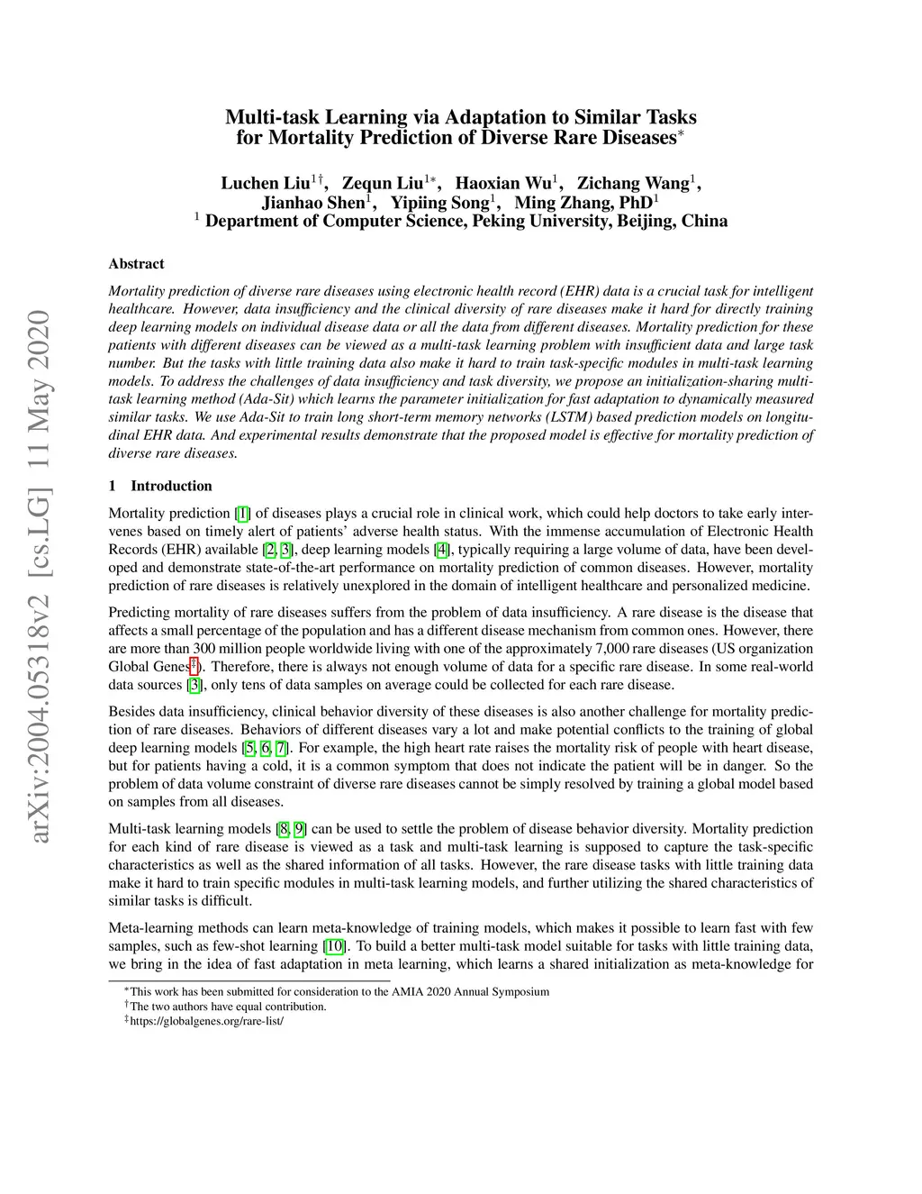 Mortality prediction of diverse rare diseases using electronic health record (EHR) data is a crucial task for intelligent healthcare. However, data insufficiency and the clinical diversity of rare diseases make it hard for directly training deep learning models on individual disease data or all the data from different diseases. Mortality prediction for these patients with different diseases can be viewed as a multi-task learning problem with insufficient data and large task number. But the tasks with little training data also make it hard to train task-specific modules in multi-task learning models. To address the challenges of data insufficiency and task diversity, we propose an initialization-sharing multi-task learning method (Ada-Sit) which learns the parameter initialization for fast adaptation to dynamically measured similar tasks. We use Ada-Sit to train long short-term memory networks (LSTM) based prediction models on longitudinal EHR data. And experimental results demonstrate that the proposed model is effective for mortality prediction of diverse rare diseases.