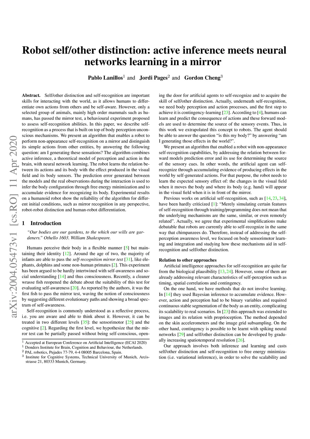 Self/other distinction and self-recognition are important skills for interacting with the world, as it allows humans to differentiate own actions from others and be self-aware. However, only a selected group of animals, mainly high order mammals such as humans, has passed the mirror test, a behavioural experiment proposed to assess self-recognition abilities. In this paper, we describe self-recognition as a process that is built on top of body perception unconscious mechanisms. We present an algorithm that enables a robot to perform non-appearance self-recognition on a mirror and distinguish its simple actions from other entities, by answering the following question: am I generating these sensations? The algorithm combines active inference, a theoretical model of perception and action in the brain, with neural network learning. The robot learns the relation between its actions and its body with the effect produced in the visual field and its body sensors. The prediction error generated between the models and the real observations during the interaction is used to infer the body configuration through free energy minimization and to accumulate evidence for recognizing its body. Experimental results on a humanoid robot show the reliability of the algorithm for different initial conditions, such as mirror recognition in any perspective, robot-robot distinction and human-robot differentiation.