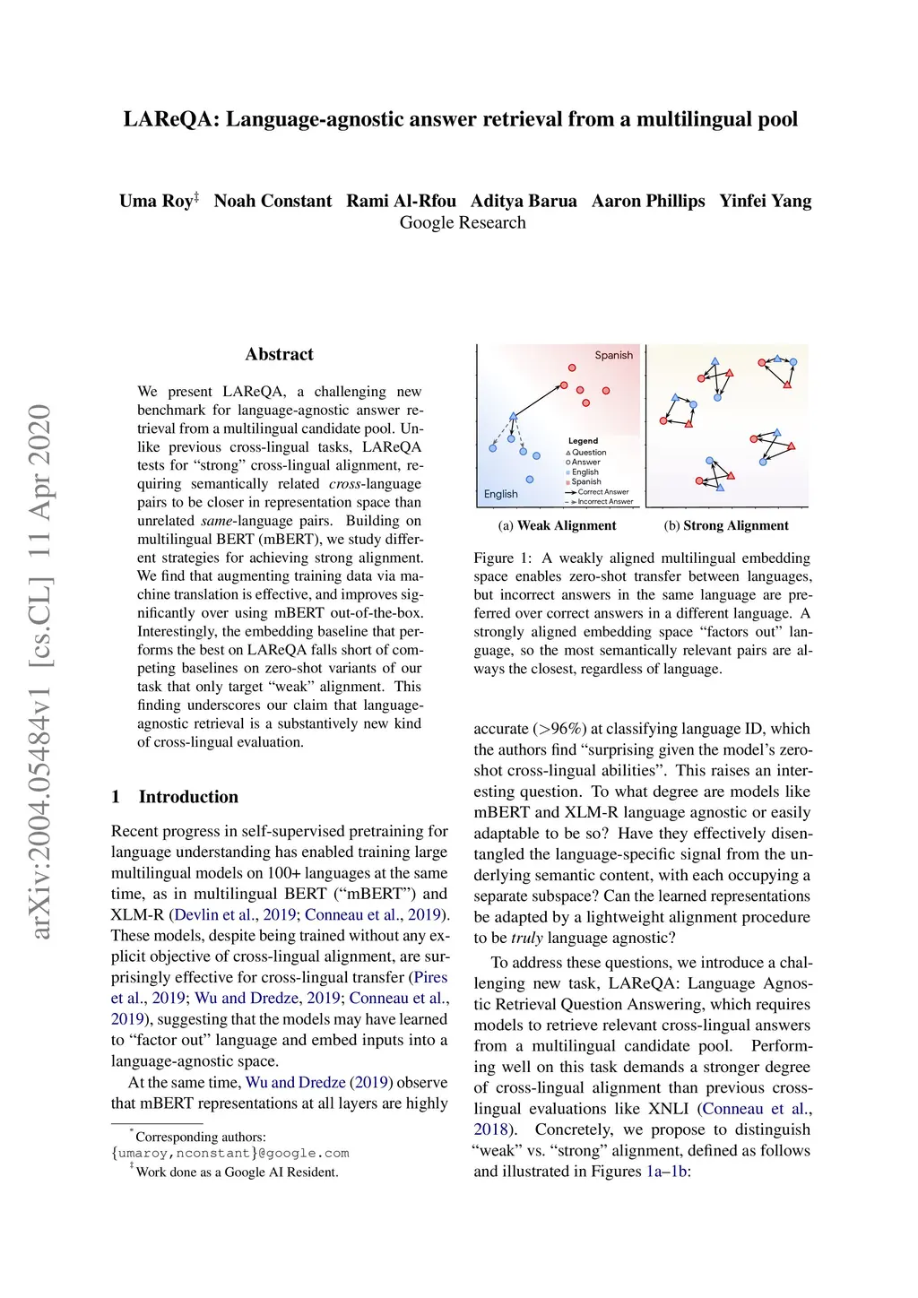LAReQA: Language-agnostic answer retrieval from a multilingual pool
