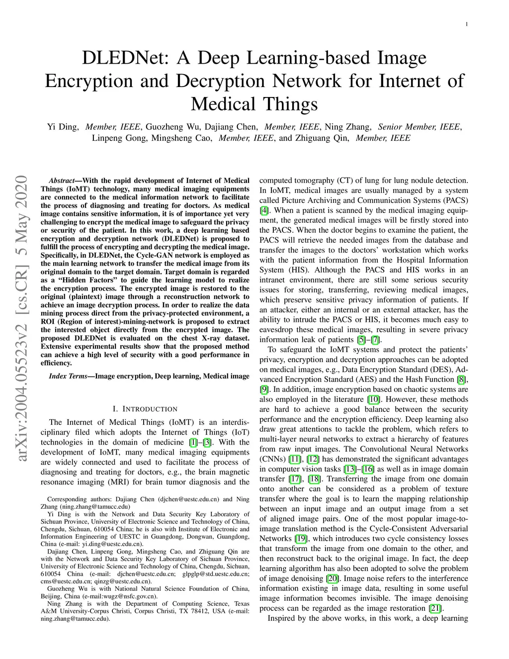 Internet of Medical Things (IoMT) can connect many medical imaging equipments to the medical information network to facilitate the process of diagnosing and treating for doctors. As medical image contains sensitive information, it is of importance yet very challenging to safeguard the privacy or security of the patient. In this work, a deep learning based encryption and decryption network (DeepEDN) is proposed to fulfill the process of encrypting and decrypting the medical image. Specifically, in DeepEDN, the Cycle-Generative Adversarial Network (Cycle-GAN) is employed as the main learning network to transfer the medical image from its original domain into the target domain. Target domain is regarded as a "Hidden Factors" to guide the learning model for realizing the encryption. The encrypted image is restored to the original (plaintext) image through a reconstruction network to achieve an image decryption. In order to facilitate the data mining directly from the privacy-protected environment, a region of interest(ROI)-mining-network is proposed to extract the interested object from the encrypted image. The proposed DeepEDN is evaluated on the chest X-ray dataset. Extensive experimental results and security analysis show that the proposed method can achieve a high level of security with a good performance in efficiency.