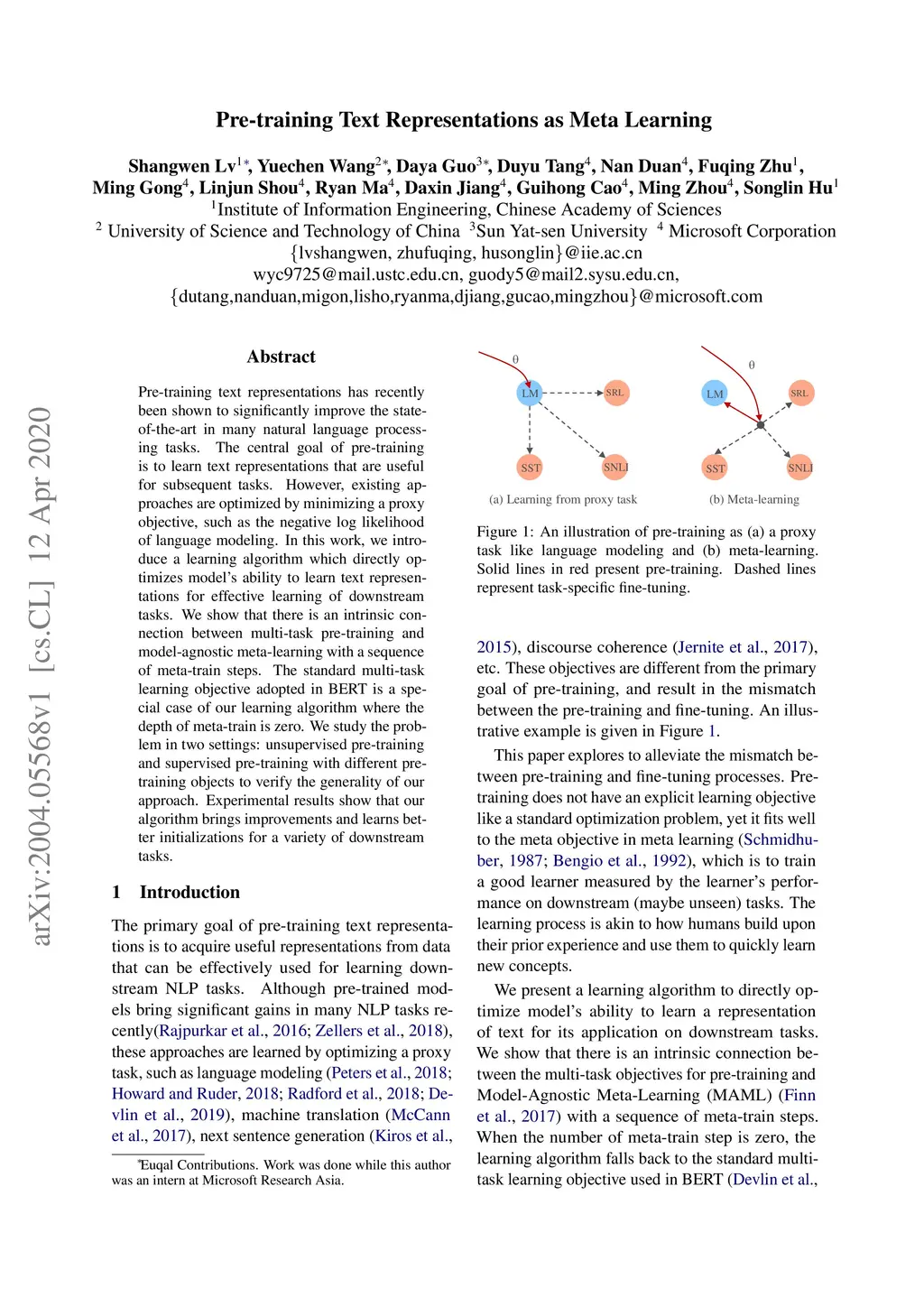 Pre-training text representations has recently been shown to significantly improve the state-of-the-art in many natural language processing tasks. The central goal of pre-training is to learn text representations that are useful for subsequent tasks. However, existing approaches are optimized by minimizing a proxy objective, such as the negative log likelihood of language modeling. In this work, we introduce a learning algorithm which directly optimizes model's ability to learn text representations for effective learning of downstream tasks. We show that there is an intrinsic connection between multi-task pre-training and model-agnostic meta-learning with a sequence of meta-train steps. The standard multi-task learning objective adopted in BERT is a special case of our learning algorithm where the depth of meta-train is zero. We study the problem in two settings: unsupervised pre-training and supervised pre-training with different pre-training objects to verify the generality of our approach.Experimental results show that our algorithm brings improvements and learns better initializations for a variety of downstream tasks.