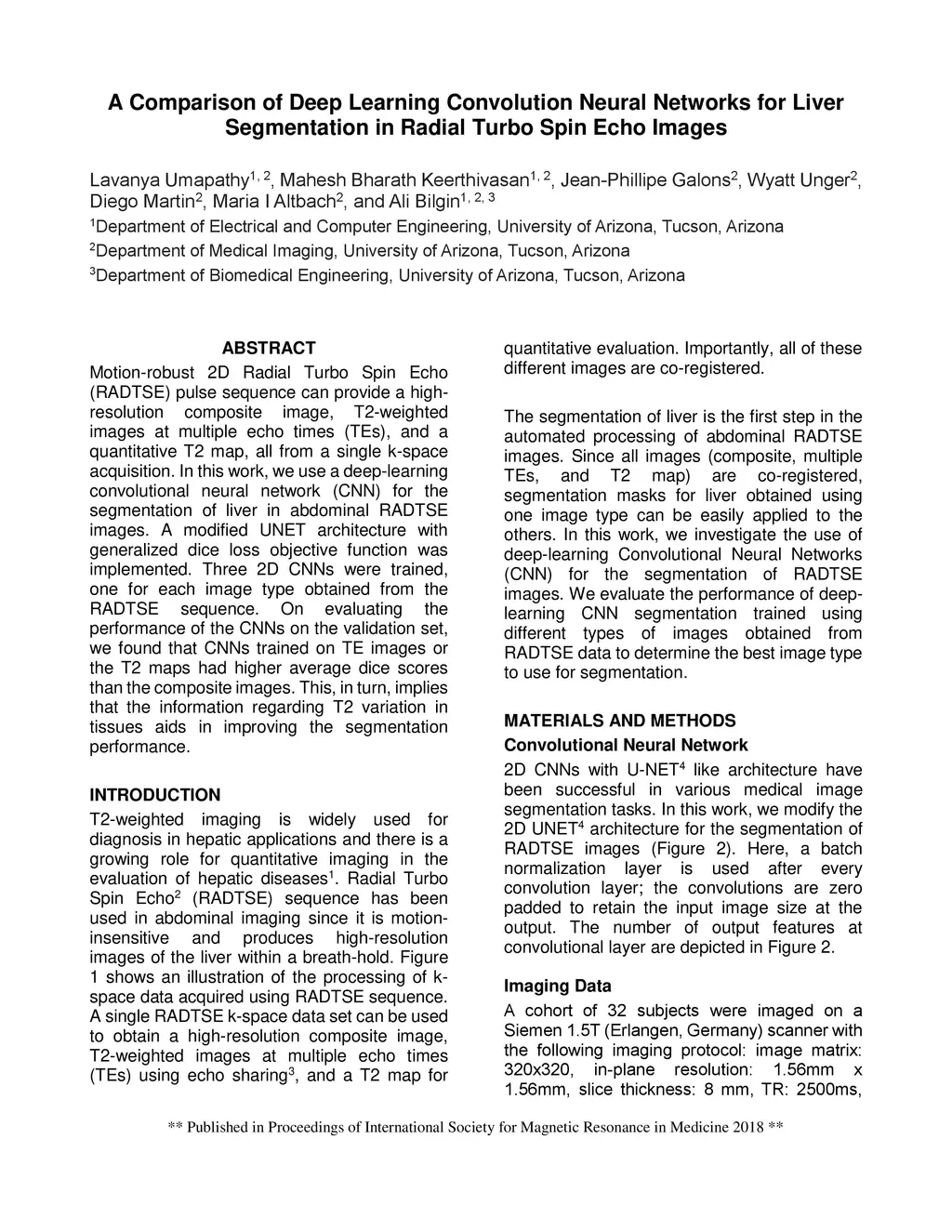 Motion-robust 2D Radial Turbo Spin Echo (RADTSE) pulse sequence can provide a high-resolution composite image, T2-weighted images at multiple echo times (TEs), and a quantitative T2 map, all from a single k-space acquisition. In this work, we use a deep-learning convolutional neural network (CNN) for the segmentation of liver in abdominal RADTSE images. A modified UNET architecture with generalized dice loss objective function was implemented. Three 2D CNNs were trained, one for each image type obtained from the RADTSE sequence. On evaluating the performance of the CNNs on the validation set, we found that CNNs trained on TE images or the T2 maps had higher average dice scores than the composite images. This, in turn, implies that the information regarding T2 variation in tissues aids in improving the segmentation performance.