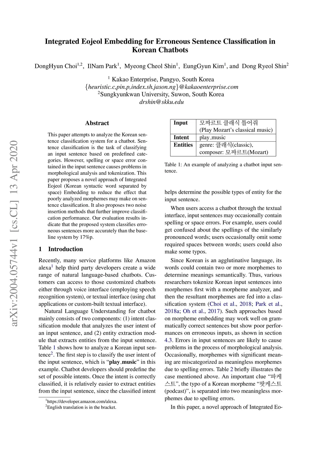 This paper attempts to analyze the Korean sentence classification system for a chatbot. Sentence classification is the task of classifying an input sentence based on predefined categories. However, spelling or space error contained in the input sentence causes problems in morphological analysis and tokenization. This paper proposes a novel approach of Integrated Eojeol (Korean syntactic word separated by space) Embedding to reduce the effect that poorly analyzed morphemes may make on sentence classification. It also proposes two noise insertion methods that further improve classification performance. Our evaluation results indicate that the proposed system classifies erroneous sentences more accurately than the baseline system by 17%p.0