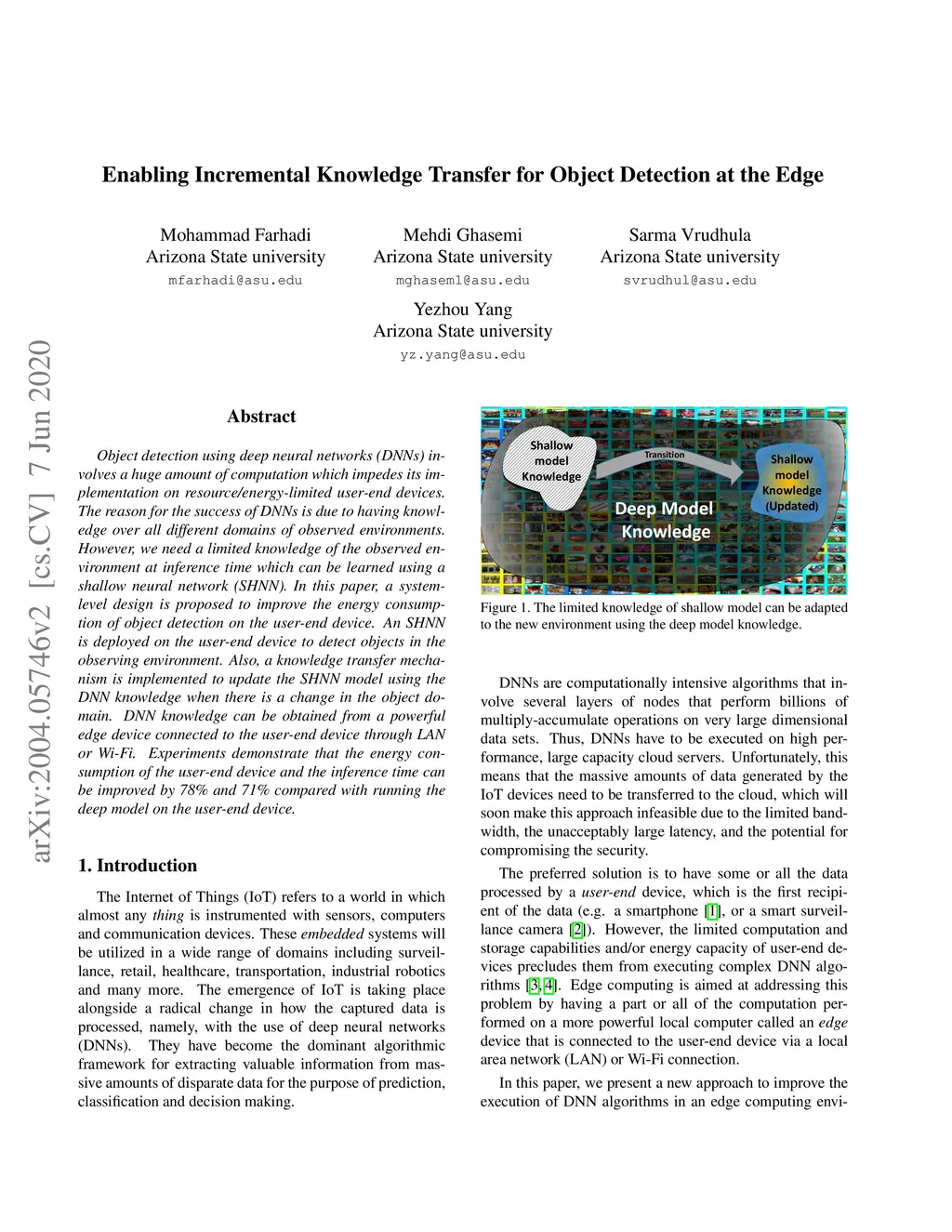 Object detection using deep neural networks (DNNs) involves a huge amount of computation which impedes its implementation on resource/energy-limited user-end devices. The reason for the success of DNNs is due to having knowledge over all different domains of observed environments. However, we need a limited knowledge of the observed environment at inference time which can be learned using a shallow neural network (SHNN). In this paper, a system-level design is proposed to improve the energy consumption of object detection on the user-end device. An SHNN is deployed on the user-end device to detect objects in the observing environment. Also, a knowledge transfer mechanism is implemented to update the SHNN model using the DNN knowledge when there is a change in the object domain. DNN knowledge can be obtained from a powerful edge device connected to the user-end device through LAN or Wi-Fi. Experiments demonstrate that the energy consumption of the user-end device and the inference time can be improved by 78% and 71% compared with running the deep model on the user-end device.