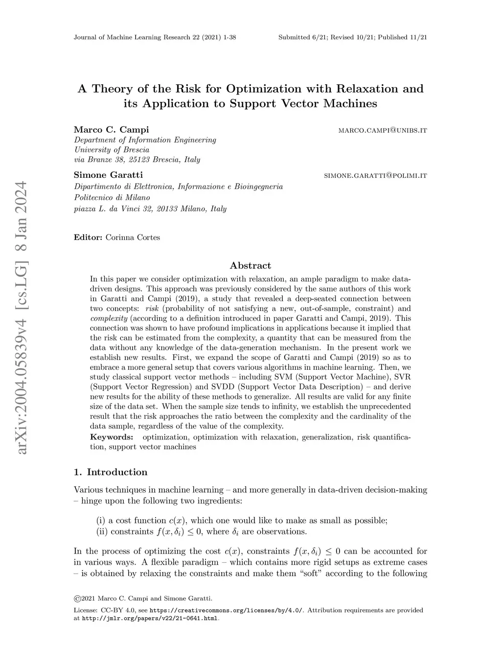 In this paper we consider optimization with relaxation, an ample paradigm to make data-driven designs. This approach was previously considered by the same authors of this work in Garatti and Campi (2019), a study that revealed a deep-seated connection between two concepts: risk (probability of not satisfying a new, out-of-sample, constraint) and complexity (according to a definition introduced in paper Garatti and Campi (2019)). This connection was shown to have profound implications in applications because it implied that the risk can be estimated from the complexity, a quantity that can be measured from the data without any knowledge of the data-generation mechanism. In the present work we establish new results. First, we expand the scope of Garatti and Campi (2019) so as to embrace a more general setup that covers various algorithms in machine learning. Then, we study classical support vector methods - including SVM (Support Vector Machine), SVR (Support Vector Regression) and SVDD (Support Vector Data Description) - and derive new results for the ability of these methods to generalize. All results are valid for any finite size of the data set. When the sample size tends to infinity, we establish the unprecedented result that the risk approaches the ratio between the complexity and the cardinality of the data sample, regardless of the value of the complexity.