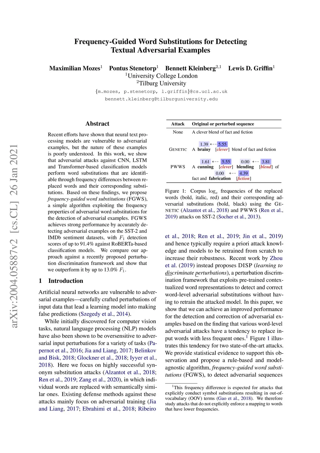 Frequency-Guided Word Substitutions for Detecting Textual Adversarial