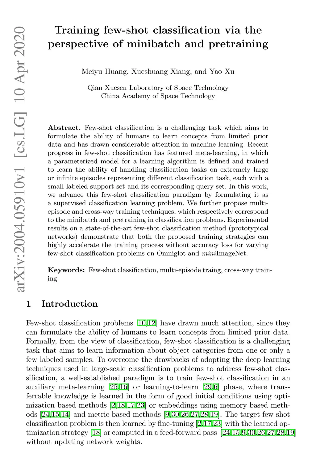 Few-shot classification is a challenging task which aims to formulate the ability of humans to learn concepts from limited prior data and has drawn considerable attention in machine learning. Recent progress in few-shot classification has featured meta-learning, in which a parameterized model for a learning algorithm is defined and trained to learn the ability of handling classification tasks on extremely large or infinite episodes representing different classification task, each with a small labeled support set and its corresponding query set. In this work, we advance this few-shot classification paradigm by formulating it as a supervised classification learning problem. We further propose multi-episode and cross-way training techniques, which respectively correspond to the minibatch and pretraining in classification problems. Experimental results on a state-of-the-art few-shot classification method (prototypical networks) demonstrate that both the proposed training strategies can highly accelerate the training process without accuracy loss for varying few-shot classification problems on Omniglot and miniImageNet.