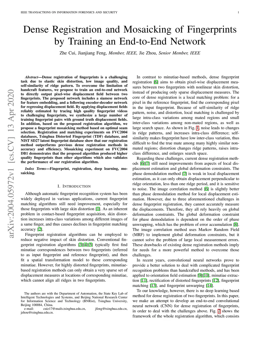 Dense registration of fingerprints is a challenging task due to elastic skin distortion, low image quality, and self-similarity of ridge pattern. To overcome the limitation of handcraft features, we propose to train an end-to-end network to directly output pixel-wise displacement field between two fingerprints. The proposed network includes a siamese network for feature embedding, and a following encoder-decoder network for regressing displacement field. By applying displacement fields reliably estimated by tracing high quality fingerprint videos to challenging fingerprints, we synthesize a large number of training fingerprint pairs with ground truth displacement fields. In addition, based on the proposed registration algorithm, we propose a fingerprint mosaicking method based on optimal seam selection. Registration and matching experiments on FVC2004 databases, Tsinghua Distorted Fingerprint (TDF) database, and NIST SD27 latent fingerprint database show that our registration method outperforms previous dense registration methods in accuracy and efficiency. Mosaicking experiment on FVC2004 DB1 demonstrates that the proposed algorithm produced higher quality fingerprints than other algorithms which also validates the performance of our registration algorithm.