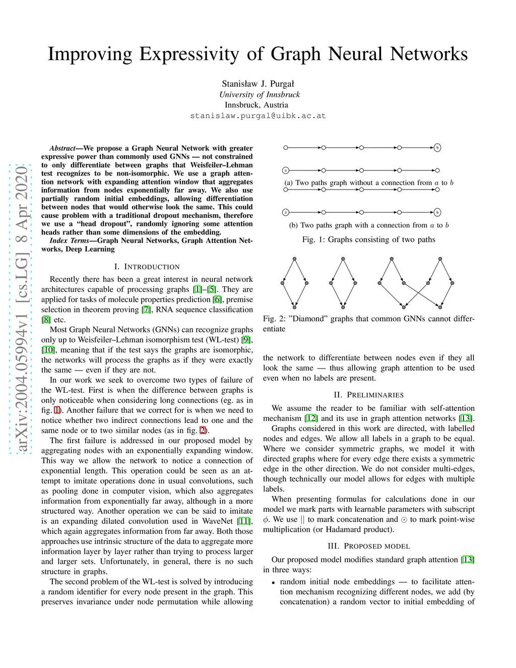 We propose a Graph Neural Network with greater expressive power than commonly used GNNs - not constrained to only differentiate between graphs that Weisfeiler-Lehman test recognizes to be non-isomorphic. We use a graph attention network with expanding attention window that aggregates information from nodes exponentially far away. We also use partially random initial embeddings, allowing differentiation between nodes that would otherwise look the same. This could cause problem with a traditional dropout mechanism, therefore we use a "head dropout", randomly ignoring some attention heads rather than some dimensions of the embedding.